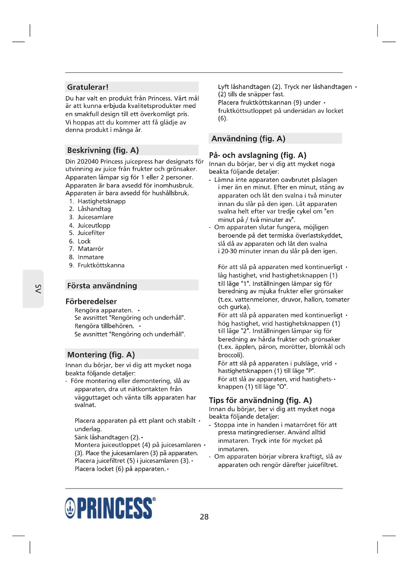 Gratulerar! Du har valt en produkt från Princess. Vårt mål är att kunna erbjuda kvalitetsprodukter med en smakfull design till ett överkomligt pris. Vi hoppas att du kommer att få glädje av denna produkt i många år. Beskrivning (fig. A) Din 202040 Princess juicepress har designats för utvinning av juice från frukter och grönsaker. Apparaten lämpar sig för 1 eller 2 personer. Apparaten är bara avsedd för inomhusbruk. Apparaten är bara avsedd för hushållsbruk.