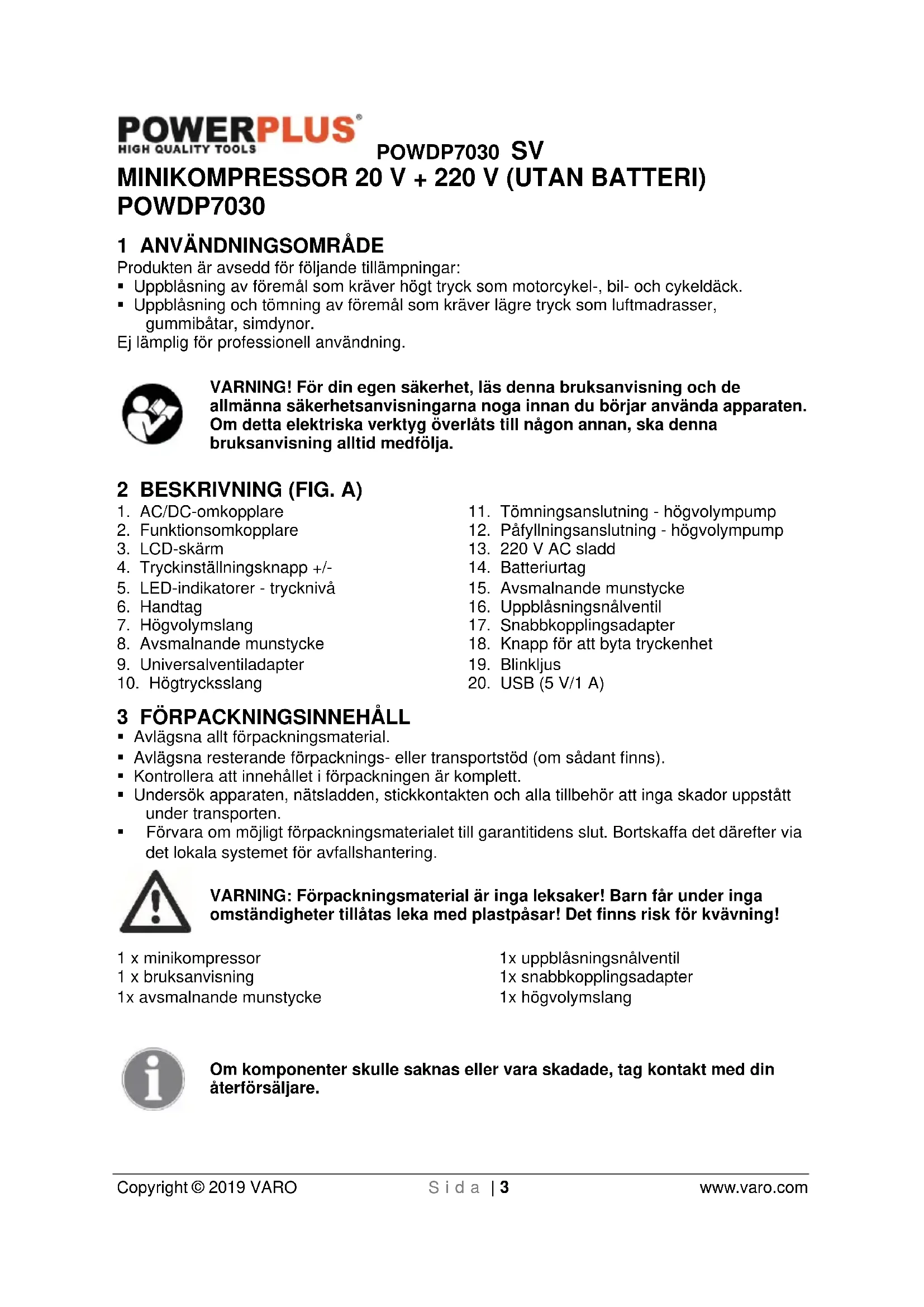 - Förvara om möjligt förpackningsmaterialet till garantitidens slut. Bortskaffa det därefter via det lokala systemet för avfallshantering. VARNING: Förpackningsmaterial är inga leksaker! Barn får under inga omständigheter tillåtas leka med plastpåsar! Det finns risk för kvävning! 1 x minikompressor 1 x bruksanvisning 1x avsmalnande munstycke 1x uppblåsningsnålventil 1x snabbkopplingsadapter 1x högvolymslang Om komponenter skulle saknas eller vara skadade, tag kontakt med din återförsäljare.POWDP7030 SV Copyright © 2019 VARO S i d a | 4 www.varo.com 4 SYMBOLER Följande symboler används i bruksanvisningen och/eller på maskinen: