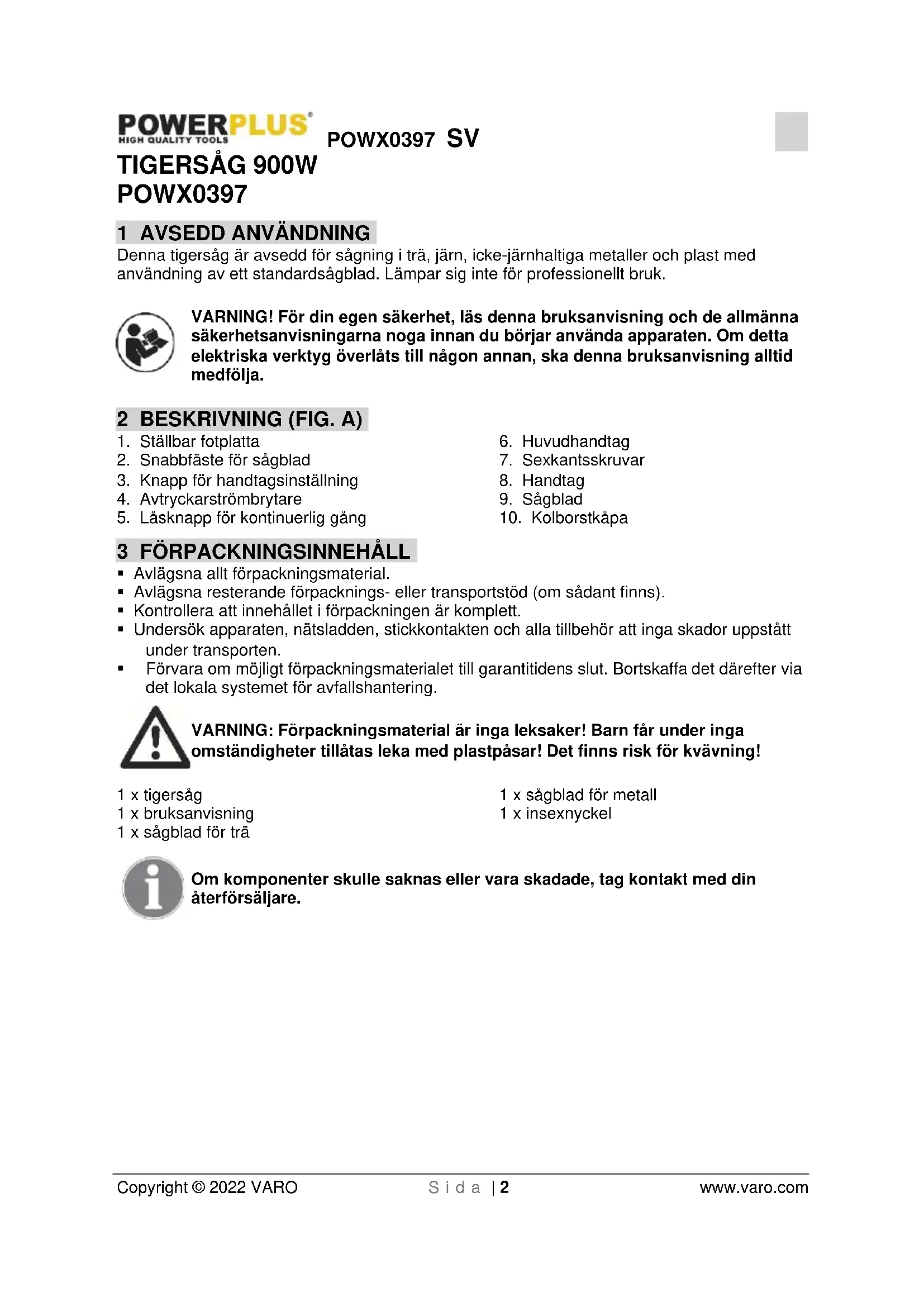 Sågblad speciellt avsedda för att såga i metall måste användas för detta ändamål. Tunn olja kan användas som kylning vid sågning i metall. Detta förebygger överhettning av sågbladet, gör att sågbladet sågar snabbare, och håller längre.POWX0397 SV Copyright © 2022 VARO S i d a | 7 www.varo.com