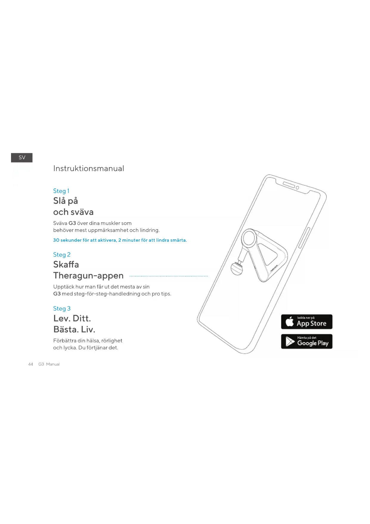 ГЕТИТЕ ЈЕSV SV 44 G3 Manual G3 Manual 45 Steg 1 Sväva G3 över dina muskler som behöver mest uppmärksamhet och lindring. Slå på och sväva Steg 2 Steg 3 Skaa Theragun-appen Lev. Ditt. Bästa. Liv. Upptäck hur man får ut det mesta av sin G3 med steg-för-steg-handledning och pro tips. Förbättra din hälsa, rörlighet och lycka. Du förtjänar det. Instruktionsmanual 30 sekunder för att aktivera, 2 minuter för att lindra smärta. ladda ner påHämta på detSV SV 44 G3 Manual G3 Manual 45 Laddningsport Utbytbara fästen Strömbrytare Multi-grepp handtag LED-batterilampa