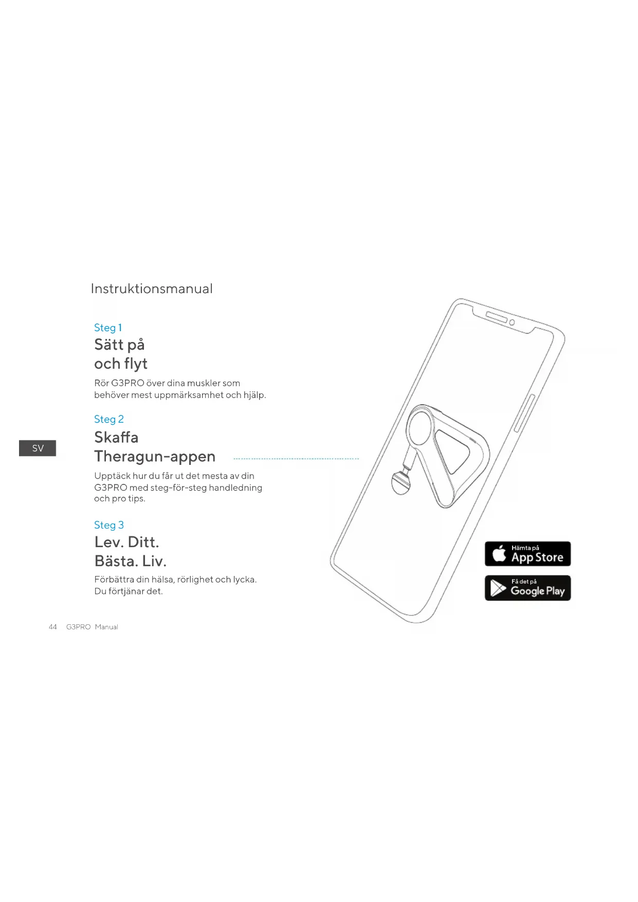 Велика лоптаСтандардна лоптаДампенерПалац44 G3PRO Manual SV SV Steg 1 Steg 2 Steg 3 Rör G3PRO över dina muskler som behöver mest uppmärksamhet och hjälp. Skaa Theragun-appen Lev. Ditt. Bästa. Liv. Sätt på och flyt Upptäck hur du får ut det mesta av din G3PRO med steg-för-steg handledning och pro tips. Förbättra din hälsa, rörlighet och lycka. Du förtjänar det. Instruktionsmanual Få det påHämta påG3PRO Manual 45 SV SV G3PRO Utbytbara fästen (2400 RPM för standardbehandling och 1750 RPM för lättare behandling). Ström | Hastighetsknapp Användning av G3PRO