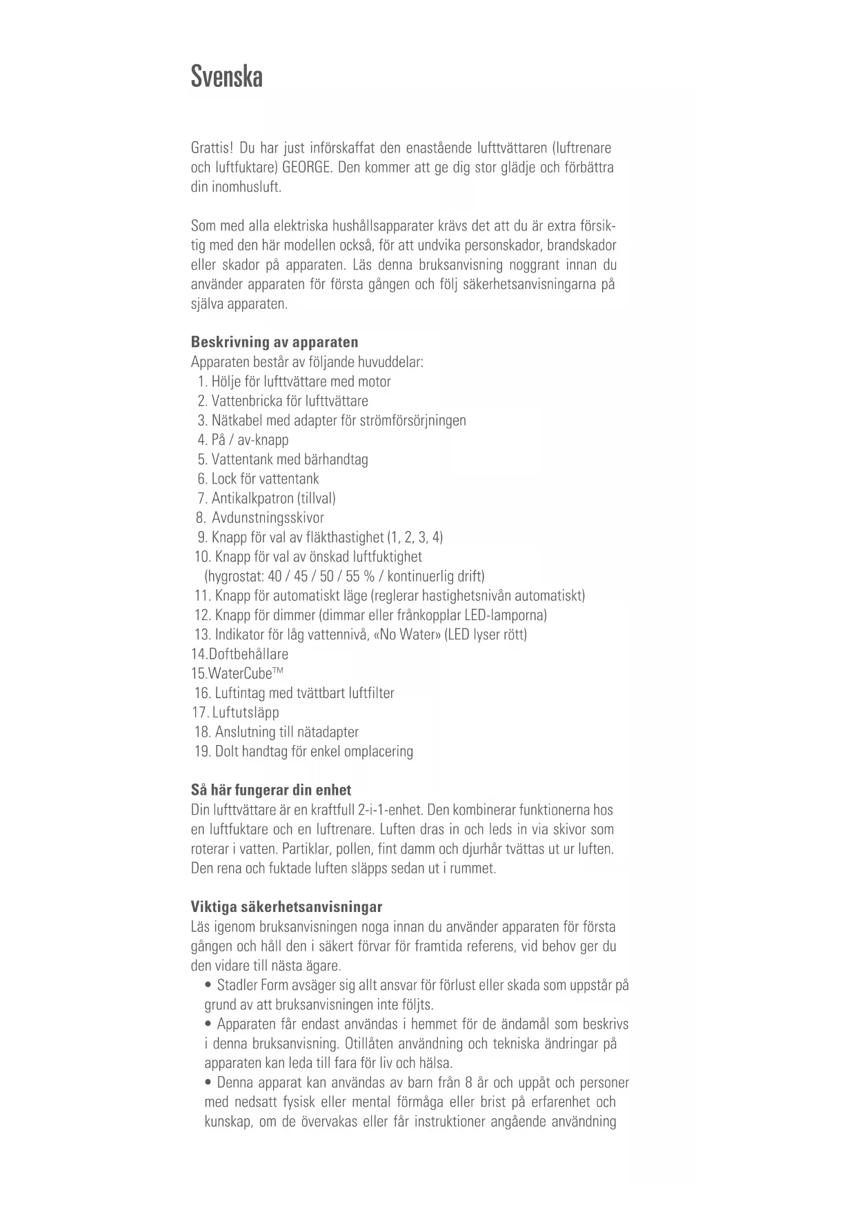 Så här fungerar din enhet Din lufttvättare är en kraftfull 2-i-1-enhet. Den kombinerar funktionerna hos en luftfuktare och en luftrenare. Luften dras in och leds in via skivor som roterar i vatten. Partiklar, pollen, fint damm och djurhår tvättas ut ur luften. Den rena och fuktade luften släpps sedan ut i rummet. Viktiga säkerhetsanvisningar Läs igenom bruksanvisningen noga innan du använder apparaten för första gången och håll den i säkert förvar för framtida referens, vid behov ger du den vidare till nästa ägare.