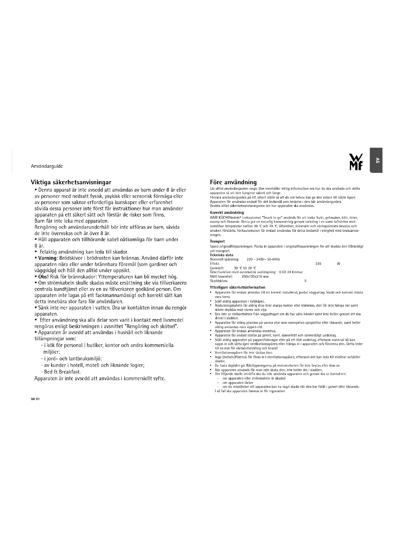 - Apparaten är avsedd att användas i hushåll och liknande tillämpningar som: ⋅ i kök för personal i butiker, kontor och andra kommersiella miljöer; ⋅ i jord- och lantbruksmiljö; ⋅ av kunder i hotell, motell och liknande logier; ⋅ Bed & Breakfast. Apparaten är inte avsedd att användas i kommersiellt syfte. Före användning Läs alltid användarguiden noga. Den innehåller viktig information om hur du ska använda och sköta apparaten så att den fungerar säkert och länge. Förvara användarguiden på ett säkert ställe så att du vid behov kan ge den vidare till näste ägare. Apparaten får användas endast för det ändamål som beskrivs i den här användarguiden. Beakta alltid säkerhetsanvisningarna om hur apparaten ska användas. Korrekt användning WMF KÜCHENminis® torkautomat ”Snack to go” används för att torka frukt, grönsaker, kött, örter, svamp och liknande. Detta ger en naturlig konservering genom torkning i en varm luftström med inställbar temperatur mellan 30 °C och 70 °C. Vitaminer, mineraler och näringsämnen bevaras och smaken förstärks. Torkautomaten får endast användas för detta ändamål i enlighet med bruksanvis- ningen. Transport Spara originalförpackningen. Packa in apparaten i originalförpackningen för att skydda den tillräckligt vid transport. Tekniska data Nominell spänning: 220 – 240V~ 50-60Hz Effekt: 220 W Varmluft: 30 °C till 70 °C Timerfunktion med automatisk avstängning: 0 till 24 timmar Mått basenhet: 290x190x216 mm Skyddsklass: II Ytterligare säkerhetsinformation
