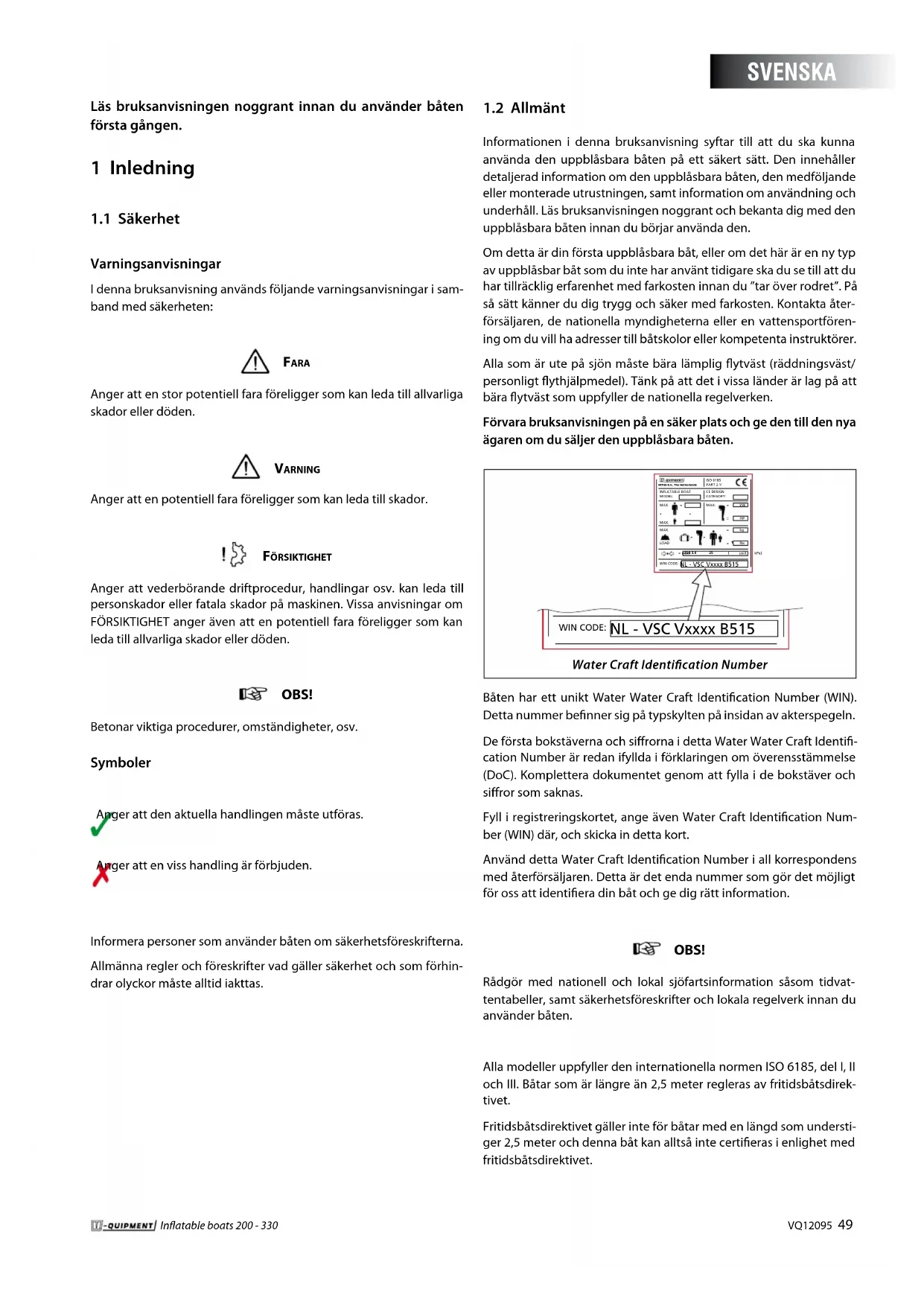 Informationen i denna bruksanvisning syftar till att du ska kunna använda den uppblåsbara båten på ett säkert sätt. Den innehåller detaljerad information om den uppblåsbara båten, den medföljande eller monterade utrustningen, samt information om användning och underhåll. Läs bruksanvisningen noggrant och bekanta dig med den uppblåsbara båten innan du börjar använda den. Om detta är din första uppblåsbara båt, eller om det här är en ny typ av uppblåsbar båt som du inte har använt tidigare ska du se till att du har tillräcklig erfarenhet med farkosten innan du ”tar över rodret”. På så sätt känner du dig trygg och säker med farkosten. Kontakta åter- försäljaren, de nationella myndigheterna eller en vattensportfören- ing om du vill ha adresser till båtskolor eller kompetenta instruktörer. Alla som är ute på sjön måste bära lämplig ytväst (räddningsväst/ personligt ythjälpmedel). Tänk på att det i vissa länder är lag på att bära ytväst som uppfyller de nationella regelverken. Förvara bruksanvisningen på en säker plats och ge den till den nya ägaren om du säljer den uppblåsbara båten. SVENSKA50 VQ12095 Inatable boats 200- 330