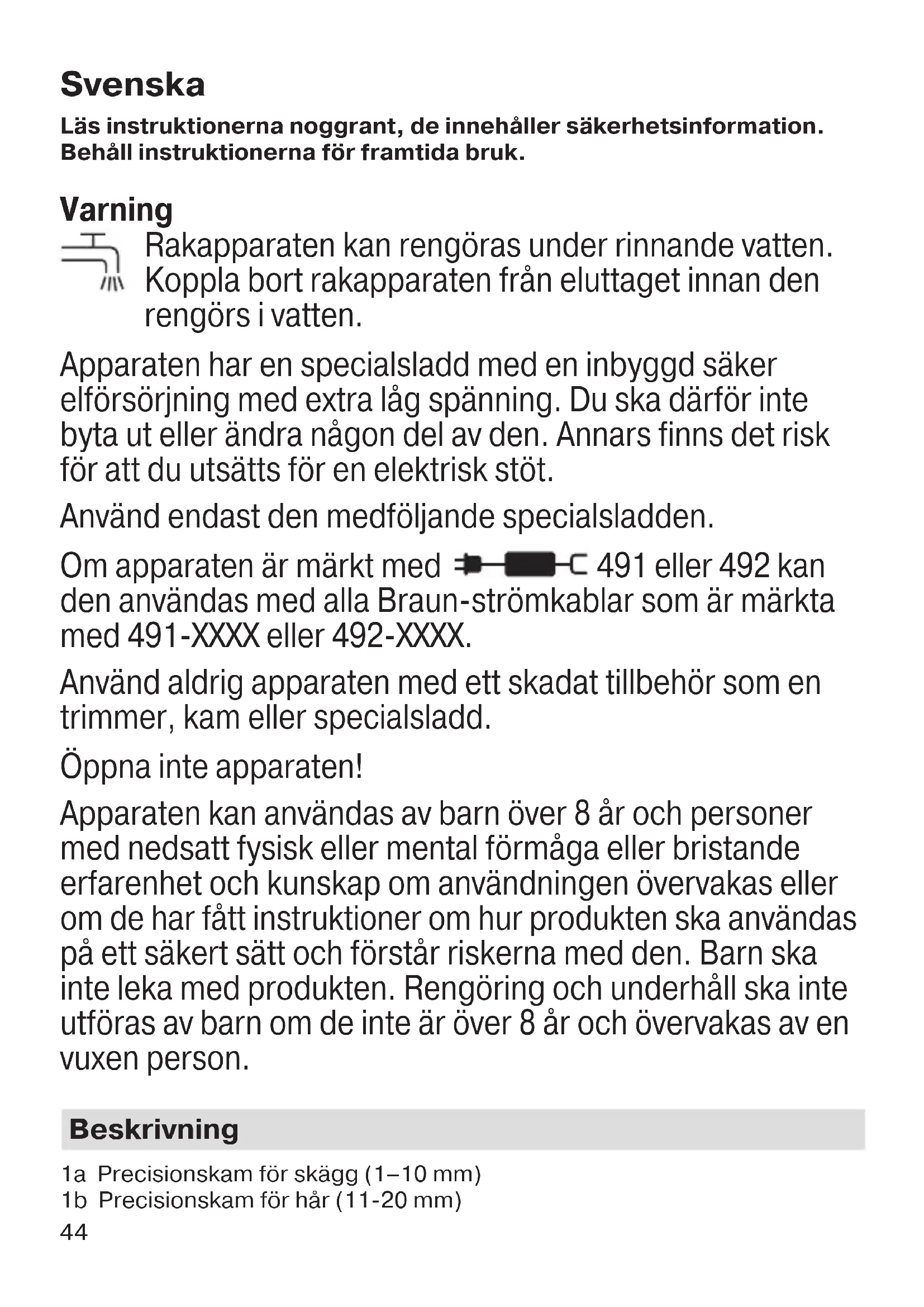 For varer kjøpt i Norge har kunden garanti i henhold til NEL’s Leverings- betingelser. 91834978_BT_7040-7940-7020-5065-5060-5042-5040_MN_ANZ.indd 4391834978_BT_7040-7940-7020-5065-5060-5042-5040_MN_ANZ.indd 43 16.04.18 11:2516.04.18 11:25 Business Use - P&G AUTHORIZED POA-00043781 Rev 001 Effective Date 2018-04-20 Printed 2019-02-27 Page 43 of 5644 Svenska Läs instruktionerna noggrant, de innehåller säkerhetsinformation. Behåll instruktionerna för framtida bruk. Varning Rakapparaten kan rengöras under rinnande vatten. Koppla bort rakapparaten från eluttaget innan den rengörs i vatten. Apparaten har en specialsladd med en inbyggd säker elförsörjning med extra låg spänning. Du ska därför inte byta ut eller ändra någon del av den. Annars finns det risk för att du utsätts för en elektrisk stöt. Använd endast den medföljande specialsladden. Om apparaten är märkt med 491 eller 492 kan den användas med alla Braun-strömkablar som är märkta med 491-XXXX eller 492-XXXX. Använd aldrig apparaten med ett skadat tillbehör som en trimmer, kam eller specialsladd. Öppna inte apparaten! Apparaten kan användas av barn över 8 år och personer med nedsatt fysisk eller mental förmåga eller bristande erfarenhet och kunskap om användningen övervakas eller om de har fått instruktioner om hur produkten ska användas på ett säkert sätt och förstår riskerna med den. Barn ska inte leka med produkten. Rengöring och underhåll ska inte utföras av barn om de inte är över 8 år och övervakas av en vuxen person. Beskrivning 1a Precisionskam för skägg (1–10 mm) 1b Precisionskam för hår (11-20 mm) 91834978_BT_7040-7940-7020-5065-5060-5042-5040_MN_ANZ.indd 4491834978_BT_7040-7940-7020-5065-5060-5042-5040_MN_ANZ.indd 44 16.04.18 11:2516.04.18 11:25 Business Use - P&G AUTHORIZED POA-00043781 Rev 001 Effective Date 2018-04-20 Printed 2019-02-27 Page 44 of 5645 2a Trimmerhuvud 2b Detaljtrimmerhuvud* 2c Mini-rakhuvud med skärblad* 3 Längdväljare 4 På/av-knapp 5 Laddningsindikator 6 Stickkontakt 7 Specialsladd (utformning kan skifta) 8 Laddningsställ*