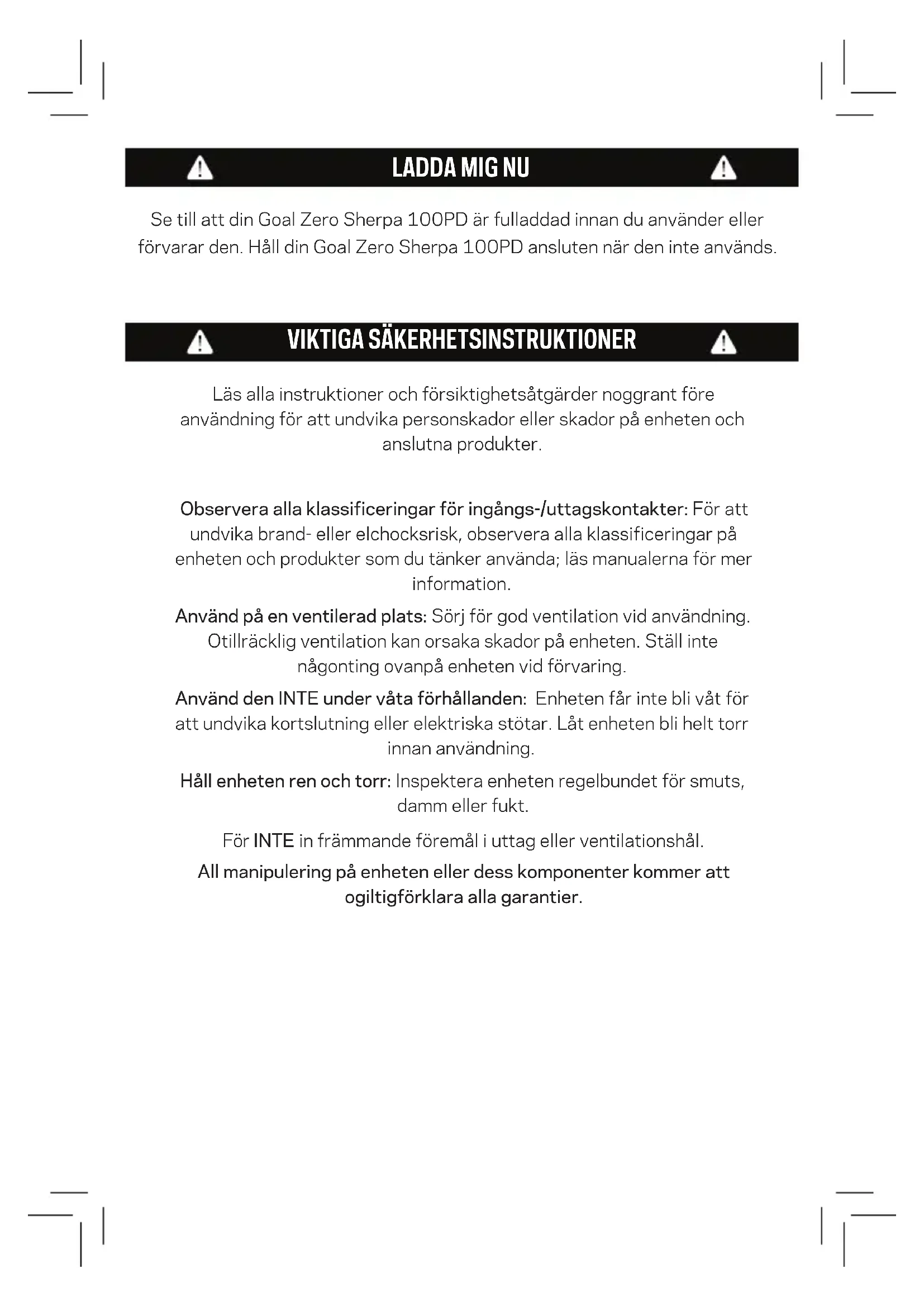 Gebruikstemperatuur 32-104F (0-40C) Certificaten Garantie 2 jaar Zorg ervoor dat u uw garantie activeert op goalzero.com/warranty63Se till att din Goal Zero Sherpa 100PD är fulladdad innan du använder eller förvarar den. Håll din Goal Zero Sherpa 100PD ansluten när den inte används. Läs alla instruktioner och försiktighetsåtgärder noggrant före användning för att undvika personskador eller skador på enheten och anslutna produkter. Observera alla klassificeringar för ingångs-/uttagskontakter: För att undvika brand- eller elchocksrisk, observera alla klassificeringar på enheten och produkter som du tänker använda; läs manualerna för mer information. Använd på en ventilerad plats: Sörj för god ventilation vid användning. Otillräcklig ventilation kan orsaka skador på enheten. Ställ inte någonting ovanpå enheten vid förvaring. Använd den INTE under våta förhållanden: Enheten får inte bli våt för att undvika kortslutning eller elektriska stötar. Låt enheten bli helt torr innan användning. Håll enheten ren och torr: Inspektera enheten regelbundet för smuts, damm eller fukt. För INTE in främmande föremål i uttag eller ventilationshål. All manipulering på enheten eller dess komponenter kommer att ogiltigförklara alla garantier.
