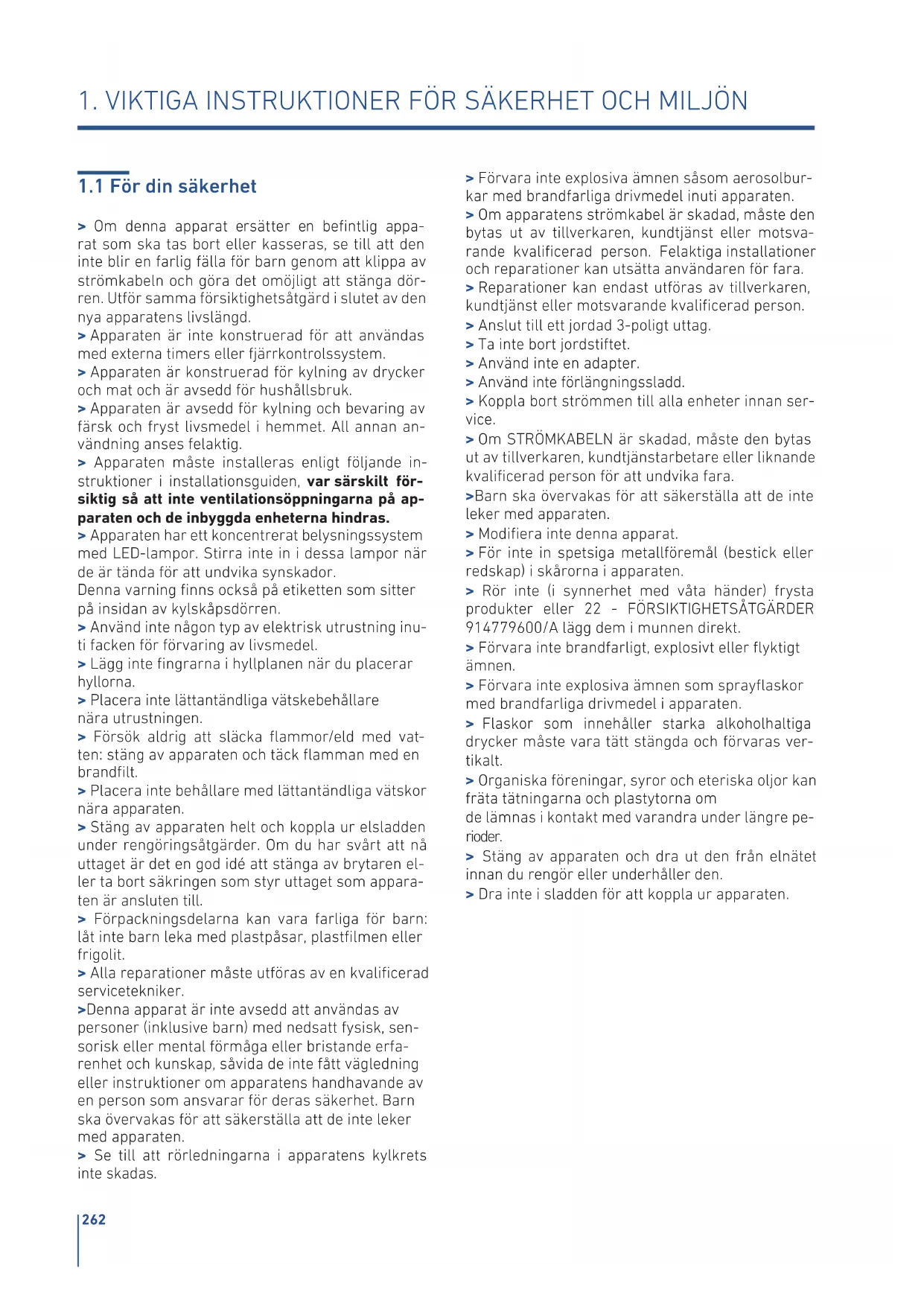 > Om denna apparat ersätter en bentlig appa- rat som ska tas bort eller kasseras, se till att den inte blir en farlig fälla för barn genom att klippa av strömkabeln och göra det omöjligt att stänga dör- ren. Utför samma försiktighetsåtgärd i slutet av den nya apparatens livslängd. > Apparaten är inte konstruerad för att användas med externa timers eller fjärrkontrolssystem. > Apparaten är konstruerad för kylning av drycker och mat och är avsedd för hushållsbruk. > Apparaten är avsedd för kylning och bevaring av färsk och fryst livsmedel i hemmet. All annan an- vändning anses felaktig. > Apparaten måste installeras enligt följande in- struktioner i installationsguiden, var särskilt för- siktig så att inte ventilationsöppningarna på ap- paraten och de inbyggda enheterna hindras. > Apparaten har ett koncentrerat belysningssystem med LED-lampor. Stirra inte in i dessa lampor när de är tända för att undvika synskador. Denna varning nns också på etiketten som sitter på insidan av kylskåpsdörren. > Använd inte någon typ av elektrisk utrustning inu- ti facken för förvaring av livsmedel. > Lägg inte ngrarna i hyllplanen när du placerar hyllorna. > Placera inte lättantändliga vätskebehållare nära utrustningen. > Försök aldrig att släcka ammor/eld med vat- ten: stäng av apparaten och täck amman med en brandlt. > Placera inte behållare med lättantändliga vätskor nära apparaten. > Stäng av apparaten helt och koppla ur elsladden under rengöringsåtgärder. Om du har svårt att nå uttaget är det en god idé att stänga av brytaren el- ler ta bort säkringen som styr uttaget som appara- ten är ansluten till. > Förpackningsdelarna kan vara farliga för barn: låt inte barn leka med plastpåsar, plastlmen eller frigolit. > Alla reparationer måste utföras av en kvalicerad servicetekniker. >Denna apparat är inte avsedd att användas av personer (inklusive barn) med nedsatt fysisk, sen- sorisk eller mental förmåga eller bristande erfa- renhet och kunskap, såvida de inte fått vägledning eller instruktioner om apparatens handhavande av en person som ansvarar för deras säkerhet. Barn ska övervakas för att säkerställa att de inte leker med apparaten. > Se till att rörledningarna i apparatens kylkrets inte skadas. > Förvara inte explosiva ämnen såsom aerosolbur- kar med brandfarliga drivmedel inuti apparaten. > Om apparatens strömkabel är skadad, måste den bytas ut av tillverkaren, kundtjänst eller motsva- rande kvalicerad person. Felaktiga installationer och reparationer kan utsätta användaren för fara. > Reparationer kan endast utföras av tillverkaren, kundtjänst eller motsvarande kvalicerad person. > Anslut till ett jordad 3-poligt uttag. > Ta inte bort jordstiftet. > Använd inte en adapter. > Använd inte förlängningssladd. > Koppla bort strömmen till alla enheter innan ser- vice. > Om STRÖMKABELN är skadad, måste den bytas ut av tillverkaren, kundtjänstarbetare eller liknande kvalicerad person för att undvika fara. >Barn ska övervakas för att säkerställa att de inte leker med apparaten. > Modiera inte denna apparat. > För inte in spetsiga metallföremål (bestick eller redskap) i skårorna i apparaten. > Rör inte (i synnerhet med våta händer) frysta produkter eller 22 - FÖRSIKTIGHETSÅTGÄRDER 914779600/A lägg dem i munnen direkt. > Förvara inte brandfarligt, explosivt eller yktigt ämnen. > Förvara inte explosiva ämnen som sprayaskor med brandfarliga drivmedel i apparaten. > Flaskor som innehåller starka alkoholhaltiga drycker måste vara tätt stängda och förvaras ver- tikalt. > Organiska föreningar, syror och eteriska oljor kan fräta tätningarna och plastytorna om de lämnas i kontakt med varandra under längre pe- rioder. > Stäng av apparaten och dra ut den från elnätet innan du rengör eller underhåller den. > Dra inte i sladden för att koppla ur apparaten.263 SVSV