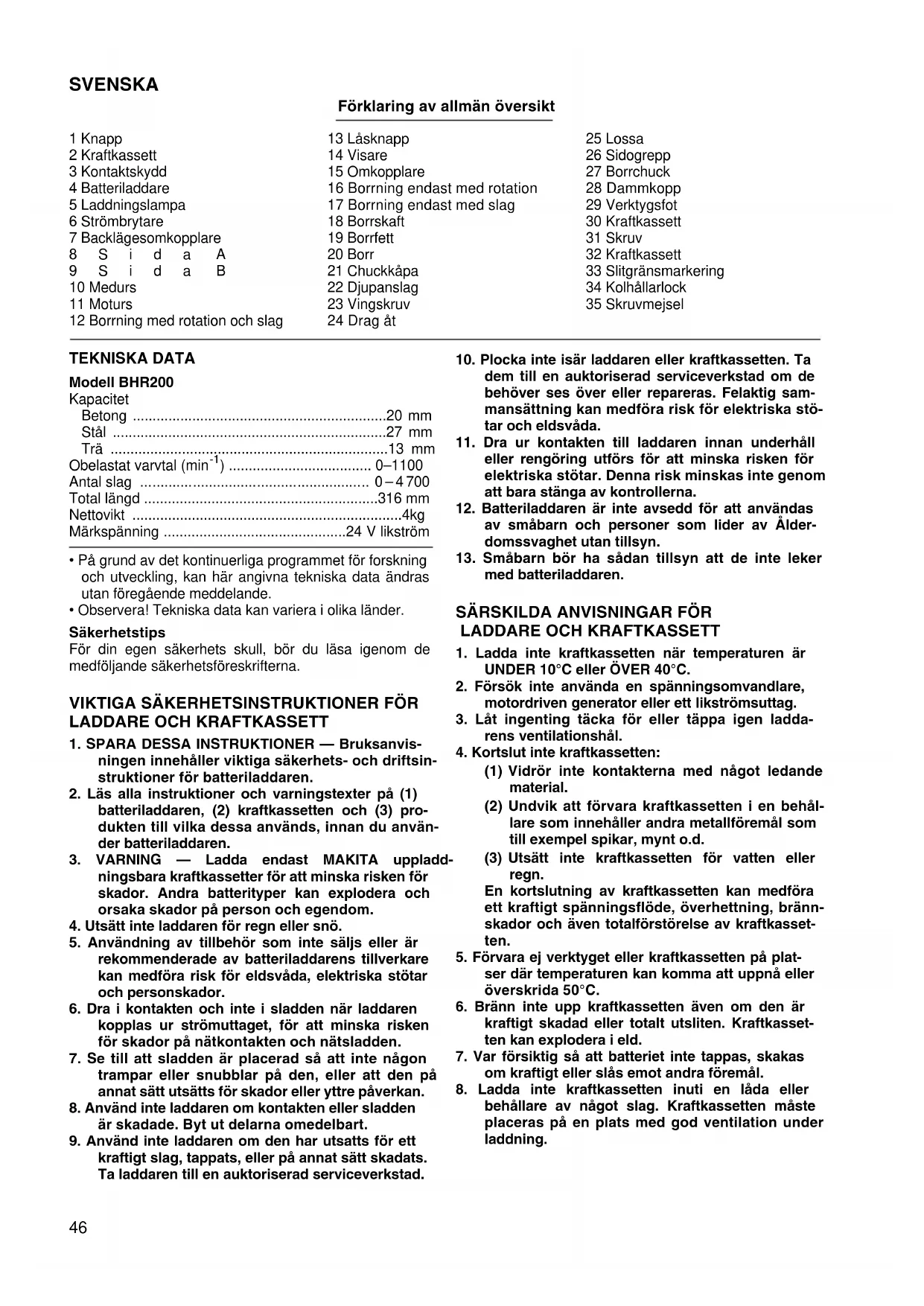 - Använd aldrig “rotation med slag” när borrchuckfästet är monterat på verktyget. Borrchuckfästet kan skadas. Blåsboll (Fig. 19) Använd blåsbollen för att göra rent hålet. Dammuppsamlare (Fig. 20) Använd dammuppsamlaren för att förhindra att damm fal- ler på verktyget och på dig själv när du utför borrningsar- beten ovanför huvudet. Anslut dammuppsamlaren på borret. Storleken på borr som dammuppsamlaren kan anslutas till är enligt följande. Verktygsfot Tag bort foten när du använder kraftkassett B2417. Detta gör det lättare att hålla verktyget på plats. (Fig. 21) Sätt på foten när du använder kraftkassett B2430. Detta gör det lättare att hålla verktyget på plats. (Fig.22) UNDERHÅLL FÖRSIKTIGHET: Tillse alltid att verktyget är frånkopplat och att kraftkas- setten tagits ur verktyget innan Du utför arbete på det. Utbyte av kolborstar (Fig.23 och24) Tag ur och kontrollera kolborstarna regelbundet. Byt ut dem när de har slitits ner till slitgränsmarkeringen. Håll kolborstarna rena, och se till att de kan röra sig fritt i hål- larna. Båda kolborstarna ska bytas ut på en gång. Använd endast identiska kolborstar. Använd en skruvmejsel för att ta bort kolborsthållarnas lock. Tag ur de slitna kolborstarna, sätt i de nya och sätt tillbaka kolborsthållarnas lock. För att bibehålla produktens säkerhet och tillförlitlighet, bör alltid reparationer, underhållsservice och justeringar utföras av auktoriserad Makita serviceverkstad. Borrdiameter (mm) Dammuppsamlare 5 6 – 14,5 Dammuppsamlare 9 12 – 1651 NORSK Forklaring til generell oversikt 1 Knapp 2Batteri 3 Terminaldeksel 4 Batterilader 5 Ladelamper 6 Startbryter 7 Reverseringshendel 8A-side 9B-side 10 Medurs 11 Moturs 12 Rotasjon med slag 13 Låseknapp 14 Viser 15 Skiftehendel 16 Kun rotasjon 17 Kun slag 18 Kroneskaft 19 Borkronefett 20 Bit 21 Chuckdeksel 22 Dybdemåler 23 Klemskrue 24 Trekk til 25 Løsne 26 Sidehåndtak 27 Borpatron 28 Støvkopp 29 Fot 30 Batteri 31 Skrue 32 Batteri 33 Slitasjegrense 34 Børsteholderhette 35 Skrutrekker TEKNISKE DATA Modell BHR200 Kapasitet Betong .............................................................. 20mm Stål .................................................................... 27 mm Tre ...................................................................... 13mm Tomgangshastighet (min