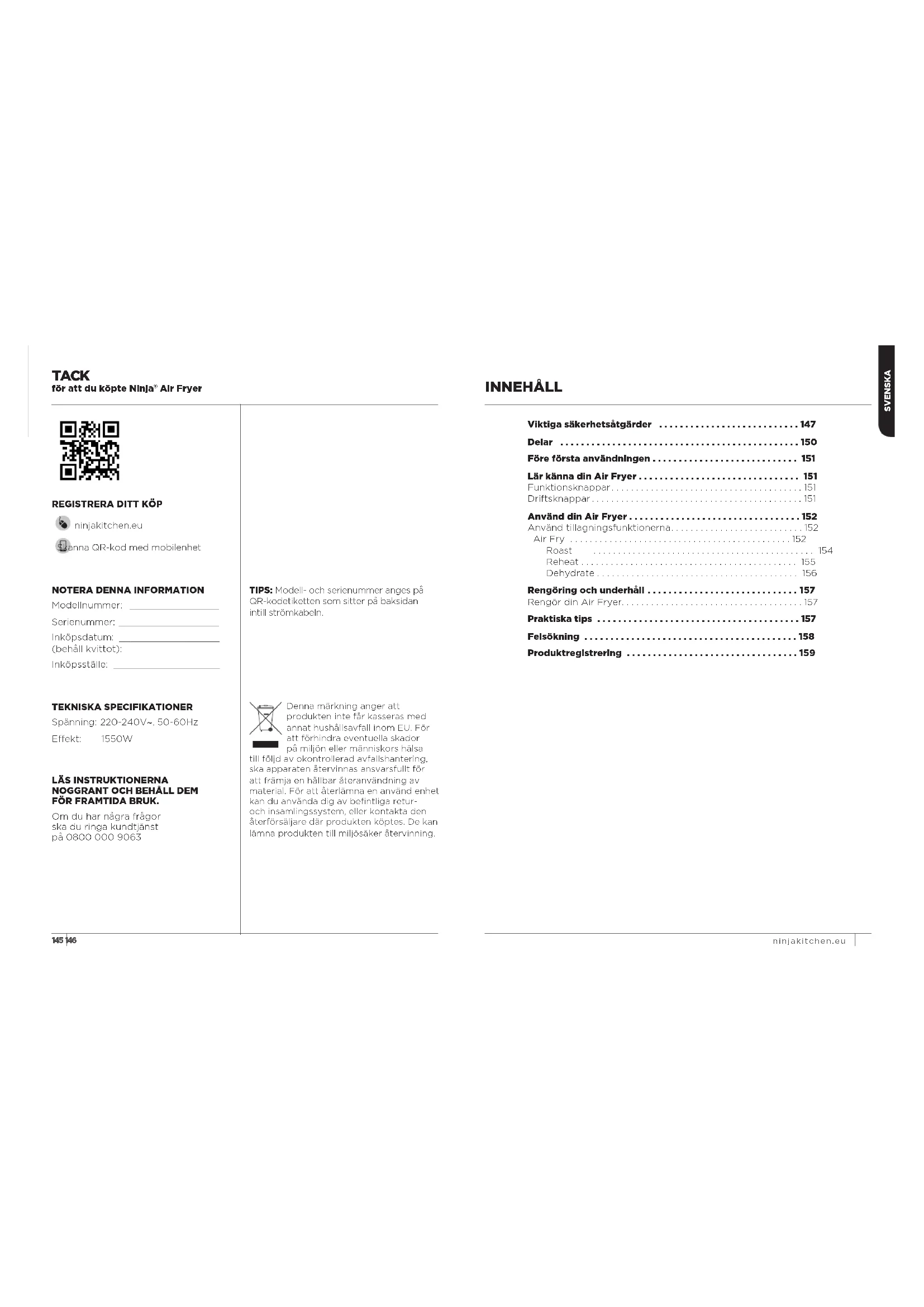 FÖR FRAMTIDA BRUK. Om du har några frågor ska du ringa kundtjänst på 0800 000 9063 TEKNISKA SPECIFIKATIONER Spänning: 220-240V~, 50-60Hz Eekt: 1550W TIPS: Modell- och serienummer anges på QR-kodetiketten som sitter på baksidan intill strömkabeln.