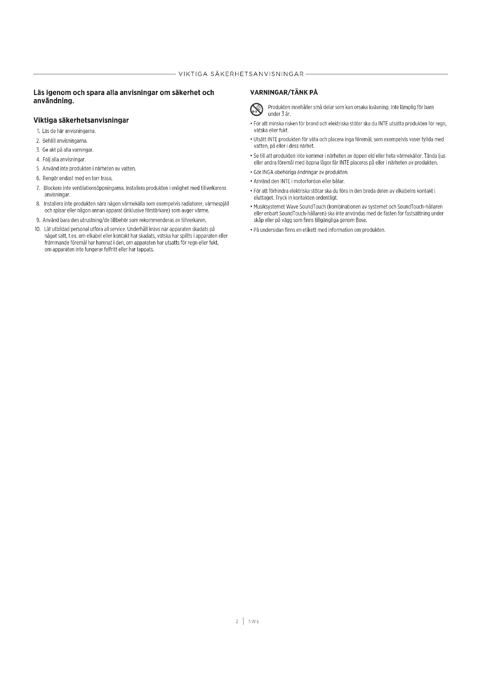 - Musiksystemet Wave SoundTouch (kombinationen av systemet och SoundTouch-hållaren eller enbart SoundTouch-hållaren) ska inte användas med de fästen för fastsättning under skåp eller på vägg som finns tillgängliga genom Bose.