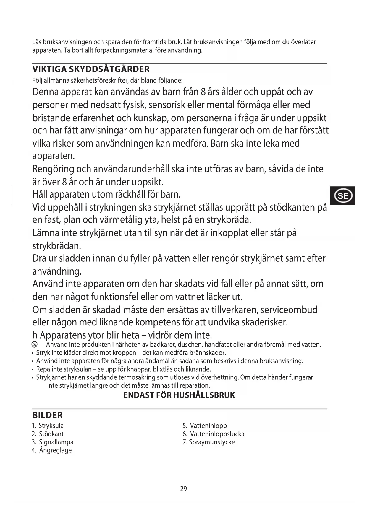 Följ allmänna säkerhetsföreskrifter, däribland följande: Denna apparat kan användas av barn från 8 års ålder och uppåt och av personer med nedsatt fysisk, sensorisk eller mental förmåga eller med bristande erfarenhet och kunskap, om personerna i fråga är under uppsikt och har fått anvisningar om hur apparaten fungerar och om de har förstått vilka risker som användningen kan medföra. Barn ska inte leka med apparaten. Rengöring och användarunderhåll ska inte utföras av barn, såvida de inte är över 8 år och är under uppsikt. Håll apparaten utom räckhåll för barn. Vid uppehåll i strykningen ska strykjärnet ställas upprätt på stödkanten på en fast, plan och värmetålig yta, helst på en strykbräda. Lämna inte strykjärnet utan tillsyn när det är inkopplat eller står på strykbrädan. Dra ur sladden innan du fyller på vatten eller rengör strykjärnet samt efter användning. Använd inte apparaten om den har skadats vid fall eller på annat sätt, om den har något funktionsfel eller om vattnet läcker ut. Om sladden är skadad måste den ersättas av tillverkaren, serviceombud eller någon med liknande kompetens för att undvika skaderisker. h Apparatens ytor blir heta – vidrör dem inte. b Använd inte produkten i närheten av badkaret, duschen, handfatet eller andra föremål med vatten.