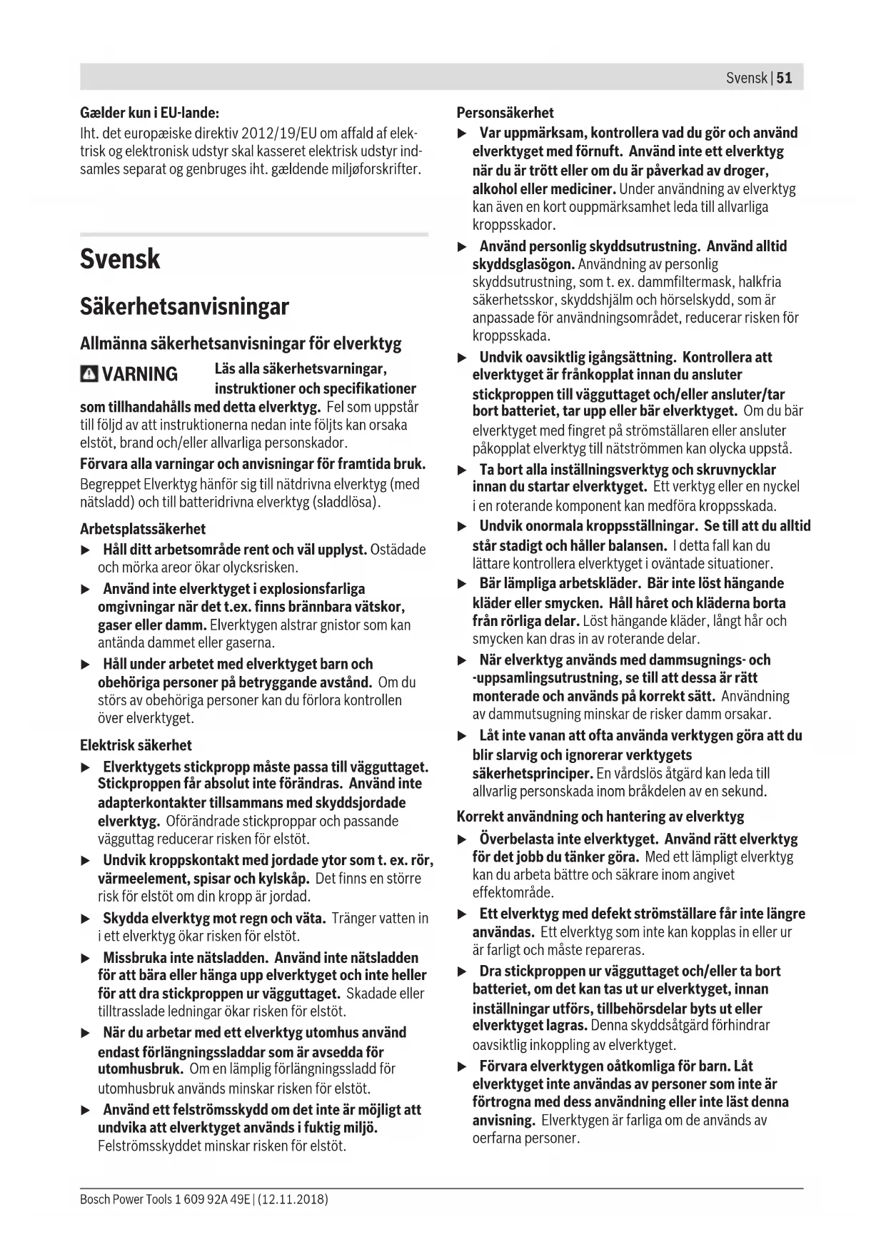 Den vibrationsnivå och det bullervärde som anges i dessa anvisningar har uppmätts enligt en mätmetod som normerats och kan användas för att jämföra elverktyg med varandra. Mätmetoden är även lämplig för preliminär bedömning av vibrations- och bullernivån. Den angivna vibrations- och bullernivån representerar den huvudsakliga användningen av elverktyget. Om däremot elverktyget används för andra ändamål, med andra insatsverktyg eller inte underhållits ordentligt kan vibrations- och bullernivån avvika. Då kan vibrations- och bullernivån under arbetsperioden öka betydligt under hela arbetstiden. För en exakt bedömning av vibrations- och bullernivån bör även de tider beaktas när elverktyget är avstängt eller är igång, men inte används. Detta reducerar vibrations- och bullerbelastningen för den totala arbetsperioden betydligt. Bestäm extra säkerhetsåtgärder för att skydda operatören mot vibrationernas inverkan t.ex.: underhåll av elverktyget och insatsverktygen, att hålla händerna varma, organisation av arbetsförloppen. Montage u Dra stickproppen ur nätuttaget innan arbeten utförs på elverktyget. Verktygsbyte u Var försiktig vid byte av hyvelkniven. Ta inte i hyvelknivens egg. Du kan skada dig på de vassa kanterna. Använd endast original HM/TC-hyvelkniv från Bosch. Hyvelkniven i hårdmetall (HM/TC) har två eggar och kan vändas. Om båda eggar är slöa måste hyvelkniven (14) bytas ut. HM/TC-hyvelkniven får inte efterslipas. Demontera hyvelkniven (se bild A) För att vända eller byta ut hyvelkniven (14) vrider du knivhuvudet (11) tills det står parallellt med hyvelsulan (9). ➊ Lossa de 2 fästskruvarna (13) med insexnyckel (15) ca. 1–2 varv. ➋ Lossa vid behov fästet (12) genom ett lätt slag med lämpligt verktyg, t.ex. en träkil. ➌ Skjut hyvelkniven (14) sidlängs ur knivhuvudet (11) med en träbit. Montera hyvelkniven (se bild B) Genom styrspåret på hyvelkniven garanteras en jämn höjdinställning. Vid behov, rengör knivfästet (12) och hyvelkniven (14). När du monterar hyvelkniven, se till att den sitter korrekt i spåret på fästet (12) och ligger parallellt med kanten på den bakre hyvelsulan (9). Dra sedan åt de 2 fästskruvarna (13) med insexnyckeln (15). Observera: innan idrifttagning, kontrollera att fästskruvarna (13) sitter fast. Vrid knivhuvudet (11) för hand och se till att hyvelkniven inte berör någon annan del. Damm-/spånutsugning Dammet från material som t.ex. blyhaltig målning, vissa träslag, mineraler och metall kan vara hälsovådligt. Beröring eller inandning av dammet kan orsaka allergiska reaktioner och/eller andningsbesvär hos användaren eller personer som uppehåller sig i närheten. Vissa damm från ek eller bok anses vara cancerogena, speciellt då i förbindelse med tillsatsämnen för träbehandling (kromat, träkonserveringsmedel). Endast yrkesmän får bearbeta asbesthaltigt material. – Använd om möjligt en för materialet lämplig dammutsugning. – Se till att arbetsplatsen är väl ventilerad. – Vi rekommenderar ett andningsskydd i filterklass P2. Beakta de föreskrifter som i aktuellt land gäller för bearbetat material. Bosch Power Tools 1 609 92A 49E | (12.11.2018)54 | Svensk u Undvik dammanhopning på arbetsplatsen. Damm kan lätt självantändas. Rengör spånutkastet (1) regelbundet. För att rengöra ett igensatt spånutkast ska lämpligt verktyg användas, som t.ex. en träbit eller tryckluft etc. u Stick inte in handen i spånutmatningen. Du kan skada dig på roterande delar. För att garantera ett optimalt utsug ska ett externt utsug eller en damm-/spånpåse användas. Externt utsug (se bild C) Vid spånutkastet kan en utsugsslang (Ø 35 mm) (16) (tillbehör) anslutas på båda sidor (PHO 2000) eller på en sida (PHO 1500). Anslut utsugsslangen (16) till en dammsugare (tillbehör). En översikt över anslutning till olika sugare finns i slutet av denna bruksanvisning. Sugen måste vara lämplig för det material som ska bearbetas. Använd en specialsug för att suga hälsovådligt och cancerframkallande eller torrt damm. Eget utsug (se bild C) Vid mindre arbeten kan du ansluta en damm-/spånpåse (tillbehör) (17). Sätt fast dammpåsens stuts i spånutkastet (1). Töm damm-/spånpåsen (17) i god tid så att dammutsuget förblir optimalt. Valbart spånutkast (PHO 2000) Med omställningsreglaget (4) kan spånutmatningen (1) ställas till höger eller vänster. Tryck alltid omställningsreglaget (4) till ändläge tills det snäpper fast. Vald spånutkastriktning visas med en pil på omställningsreglaget (4). Drift Driftstyper Ställa in spåndjupet Med reglaget (2) kan spåndjupet ställas in steglöst från 0– 1,5 mm (PHO 1500) eller 0–2,0 mm (PHO 2000) med hjälp av spåndjupskalan (3) (skalindelning = 0,25 mm). Stativ (se bild G) Med stativet (26) kan du ställa från dig elverktyget direkt efter arbetet utan risk för att skada arbetsstycket eller hyvelkniven. Vid arbetsproceduren vrids stativet (26) uppåt och den bakre delen av hyvelsulan (9) är fri. Observera: stativet (26) får inte demonteras. Driftstart u Beakta nätspänningen! Kontrollera att strömkällans spänning överensstämmer med uppgifterna på elverktygets typskylt. Elverktyg märkta med 230V kan även anslutas till 220V. In- och urkoppling u Se till att du kan manövrera på-/av-strömbrytaren utan att släppa handtaget. För idrifttagning av elverktyget, aktivera först startspärren (5) och tryck därefter På-/av-strömbrytare (6) och håll den intryckt. För att stänga av elverktyget, släpp strömbrytaren (6). Anmärkning: Av säkerhetsskäl kan elverktygets strömställare på-/av-strömbrytare (6) inte låsas, utan måste under drift hållas nedtryckt. Arbetsanvisningar u Dra stickproppen ur nätuttaget innan arbeten utförs på elverktyget. Servicestationen i väskan kan användas som fäste för hyveln, t.ex. vid knivbyte. u Använd inte servicestationen för station