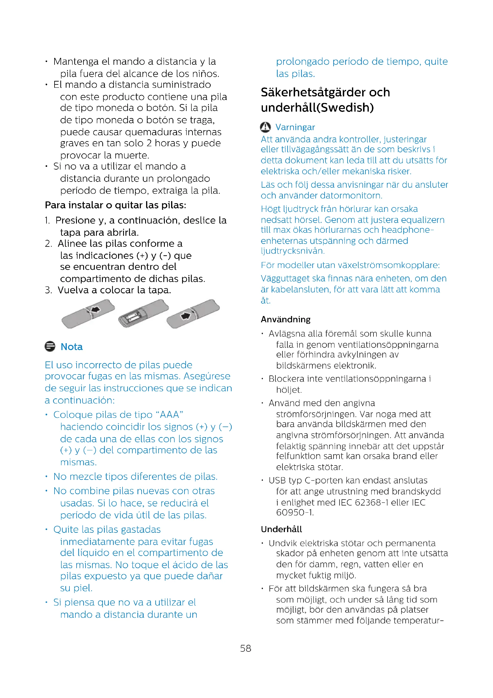 - Si piensa que no va a utilizar el mando a distancia durante un prolongado período de tiempo, quite las pilas. Säkerhetsåtgärder och underhåll(Swedish) Varningar Att använda andra kontroller, justeringar eller tillvägagångssätt än de som beskrivs i detta dokument kan leda till att du utsätts för elektriska och/eller mekaniska risker. Läs och följ dessa anvisningar när du ansluter och använder datormonitorn. Högt ljudtryck från hörlurar kan orsaka nedsatt hörsel. Genom att justera equalizern till max ökas hörlurarnas och headphone- enheternas utspänning och därmed ljudtrycksnivån. För modeller utan växelströmsomkopplare: Vägguttaget ska finnas nära enheten, om den är kabelansluten, för att vara lätt att komma åt. Användning