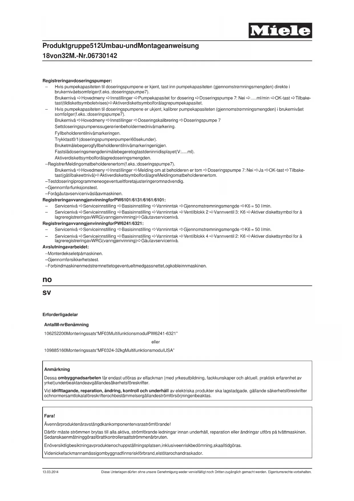 Antal M-nr Benämning 1 06252200 Monteringssats “MF03 Multifunktionsmodul PW6241-6321” eller 1 09885160 Monteringssats “MF03 24-32 kg Multifunktionsmodul USA” Anmärkning Dessa ombyggnadsarbeten får endast utföras av elfackman (med yrkesutbildning, fackkunskaper och aktuell, praktisk erfarenhet av yrket) under beaktande av gällande säkerhetsföreskrifter. Vid idrifttagande, reparation, ändring, kontroll och underhåll av elektriska produkter ska lagstadgade, gällande säkerhetsföreskrifter och normer samt lokala föreskrifter och bestämmelser gällande strömförsörjningen beaktas. Fara! Även när produkten är avstängd kan komponenter vara strömförande! Därför måste strömmen brytas till alla aktiva, strömförande ledningar innan underhåll, reparation eller ändringar utförs på tvättmaskinen. Sedan ska en mätning göras för att kontrollera att strömmen är bruten. En översiktlig besiktning av produkten och uppställningsplatsen, inklusive en riskbedömning, ska alltid göras. Vid en icke fackmannamässig ombyggnad finns risk för brand, elstötar och andra skador. Produktgruppe 512 Umbau- und Montageanweisung 18 von 32 M.-Nr. 06730142 13.03.2014 Diese Unterlagen dürfen ohne unsere Genehmigung weder vervielfältigt noch Dritten zugänglich gemacht werden. Eigentumsrechte vorbehalten.x Fara! Skyddsledarfunktionen i tvättmaskinen kan sättas ur spel genom felaktig montering av höljet. Skyddsledarfunktionen ska återställas vid monteringen av höljets delar. Utför en elektrisk säkerhetskontroll. Fara! Vid monteringen får beröringsbara, ledande komponenter som inte är anslutna till skyddsledaren inte ha någon skyddsledarförbindelse (dubbel eller förstärkt isolering). Detta ska kontrolleras genom mätning av korrekt isoleringsmotstånd och korrekt beröringsström. Anmärkning Monteringssatsen, m.nr 06197490, är avsedd för PW 6241 samt PW 6321 och innehåller: