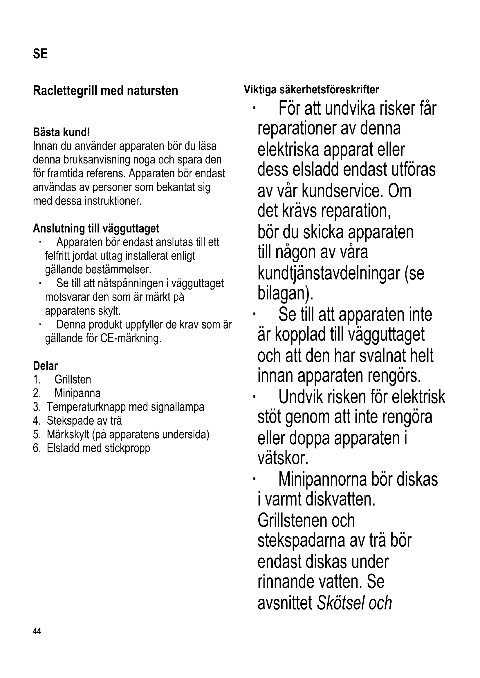 Viktiga säkerhetsföreskrifter ∙ För att undvika risker får reparationer av denna elektriska apparat eller dess elsladd endast utföras av vår kundservice. Om det krävs reparation, bör du skicka apparaten till någon av våra kundtjänstavdelningar (se bilagan). ∙ Se till att apparaten inte är kopplad till vägguttaget och att den har svalnat helt innan apparaten rengörs. ∙ Undvik risken för elektrisk stöt genom att inte rengöra eller doppa apparaten i vätskor. ∙ Minipannorna bör diskas i varmt diskvatten. Grillstenen och stekspadarna av trä bör endast diskas under rinnande vatten. Se avsnittet Skötsel och SE45 rengöring för detaljerad information om hur apparaten bör rengöras. ∙ Apparaten bör inte användas med hjälp av en extern timer eller separat fjärrkontroll. ∙ Apparaten är avsedd för hemmabruk eller liknande användning, såsom - i personalkök, kontor och andra kommersiella miljöer, - i företag inom jordbrukssektorn, - för gäster i hotell, motell och liknande inkvarteringsställen, - för gäster i bed-and- breakfast hus. ∙ Denna apparat kan användas av barn (minst 8 år gamla) och av personer som har minskad fysisk rörelseförmåga, reducerat sinnes- eller mentaltillstånd, eller som har bristfällig erfarenhet och kunskap, förutsatt att dessa personer är under uppsyn eller har fått tillräckliga instruktioner beträffande apparatens användning och vet vilka risker och säkerhetsåtgärder som användningen innefattar. ∙ Barn bör inte tillåtas leka med apparaten. ∙ Barn bör inte tillåtas rengöra eller göra service på apparaten ifall de inte är övervakade och minst 8 år gamla. ∙ Apparaten och dess elsladd bör hållas utom räckhåll för barn under 8 år. ∙ Varning: Håll barn på avstånd från apparatens förpackningsmaterial eftersom fara eventuellt kan uppstå. Det fi nns t.ex. risk för kvävning. ∙ Kontrollera noga om apparaten skadats innan du tar den i användning. Om apparaten t.ex. har tappats på en hård yta, eller om elsladden utsatts för våldsam kraft, får den inte längre46 användas. Även osynliga skador kan försämra apparatens driftsäkerhet. ∙ Apparatens ytor, grillstenen och minipannorna blir heta under användningen. Varning: Risk för brännskada. ∙ Apparaten bör alltid vara under uppsikt när den är i användning. ∙ Sladden måste hållas på säkert avstånd från apparatens heta delar. ∙ Under användningen bör apparaten placeras på en stadig, jämn och värmebeständig yta, som tål stänk och fl äckar. När man tillreder mat som innehåller mycket fett eller vätska kan man ibland inte undvika stänk. ∙ Placera inte grillen nära en vägg eller i en vrå och se till att det inte fi nns lättantändliga material i närheten. ∙ Placera inte apparaten på eller i närheten av heta ytor, öppen eld eller lättantändliga ångor. ∙ Varning: Använd inte apparaten utomhus. ∙ Innan du använder apparaten bör grillstenen placeras på apparaten ovanför värmeelementet. ∙ Dra alltid stickproppen ur vägguttaget - efter användning, - ifall apparaten skulle krångla, - innan apparaten rengörs. ∙ Ta stickproppen ur vägguttaget genom att dra i stickproppen, aldrig i sladden. ∙ Varning: Denna apparat bör endast användas med den utrustning som medföljt apparaten. ∙ Låt alltid apparaten svalna innan du avlägsnar grillstenen och innan du rengör apparaten eller sätter den i förvaring. ∙ Inget ansvar godtas om skada uppkommer till följd av felaktig användning, eller om dessa instruktioner inte följts. Användningsändamål Denna apparat är en elektrisk raclettegrill som lämpar sig för låg-fett grillning av kött, fi sk och grönsaker och för ostgratinering. Annan användning än den som beskrivs i denna bruksanvisning anses som felaktig och kan leda till personskador eller materiella skador. Innan första användningen ∙ Avlägsna allt förpackningsmaterial fullständigt. ∙ Innan du använder grillen för första gången bör du rengöra grillstenen, stekspadarna och minipannorna med en fuktad duk. ∙ Låt apparaten med sten och minipannorna värmas upp ca. 10 minuter, utan några matprodukter, för att få bort den “nya” lukt som kan uppstå när apparaten kopplas på för första gången. En liten mängd rök kan också synas. Vädra därför ordentligt genom att öppna fönster eller balkongdörrar. ∙ Låt apparaten svalna och rengör den därefter enligt beskrivningen i avsnittet Skötsel och rengöring.47 Stenen ∙ Innan apparaten kopplas på, placera stenen med den polerade sidan uppåt på grillen. Varning: Undvik att placera en kall sten på ett hett element. ∙ Stenen kan användas för att tillreda grönsaker, skivat kött eller skivad fi sk etc. ∙ Stenen är gjord av naturmaterial. Små sprickor som uppstått p.g.a. naturlig utvidgning och minskning under upphettning och avsvalning samt färgförändring till en mörkare färg är normala och har inga skadliga effekter. ∙ Placera inte fryst mat eller produkter som innehåller ättika (såsom ättiksgurkor eller senap) på stenen. Reglerbar termostat och signallampa ∙ Om termostatknappen är inställd längst till höger, kommer värmeelementet att vara påkopplat hela tiden. Om du vrider åt vänster kommer värmeelementet tidvis att slås av och kopplas på igen. ∙ Den röda signallampan fortsätter att lysa så länge som värmeelementet är påkopplat. ∙ Efter användning bör du vrida termostaten till dess lägsta nivå och dra stickproppen ur vägguttaget. Användning Tips: För optimal grillnjutning bör kött tas ur kylen ca 30 minuter före grillning och lämnas på ett täckt fat. ∙ Placera stenen med den polerade sidan uppåt på grillen. ∙ Anslut stickproppen till ett lämpligt eluttag och vrid termostaten till höger så långt det går. ∙ Låt apparaten värmas upp i ca. 25 minuter för att nå den önskade temperaturen. ∙ Placera maten som ska
