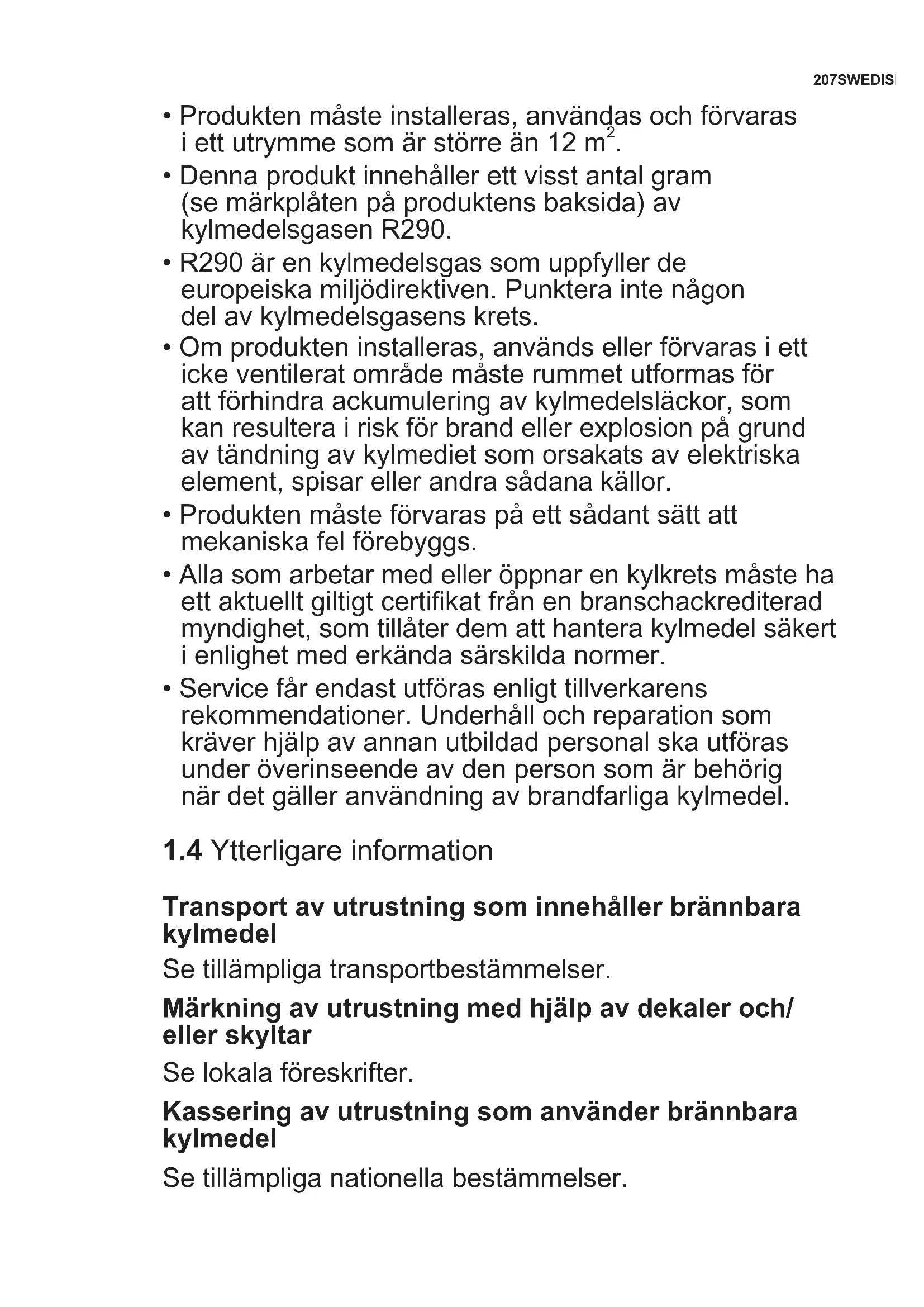 R290 År en kylmedelsgas som uppyller de europeiska miljödirektiven. Punktera inte nagon del av kylmedelsgasens krets. - Omprodukten installeras, används eller Förvaras i ett icede ventilerat område mæste rummet utformas for att Förhindra ackumulering av kylmedelsläckor, som kan resultera i riskfor brand erler explosion på grund av tändning av kylmediet som orsakats av elektriska element, spisar erler andra sādana källor.