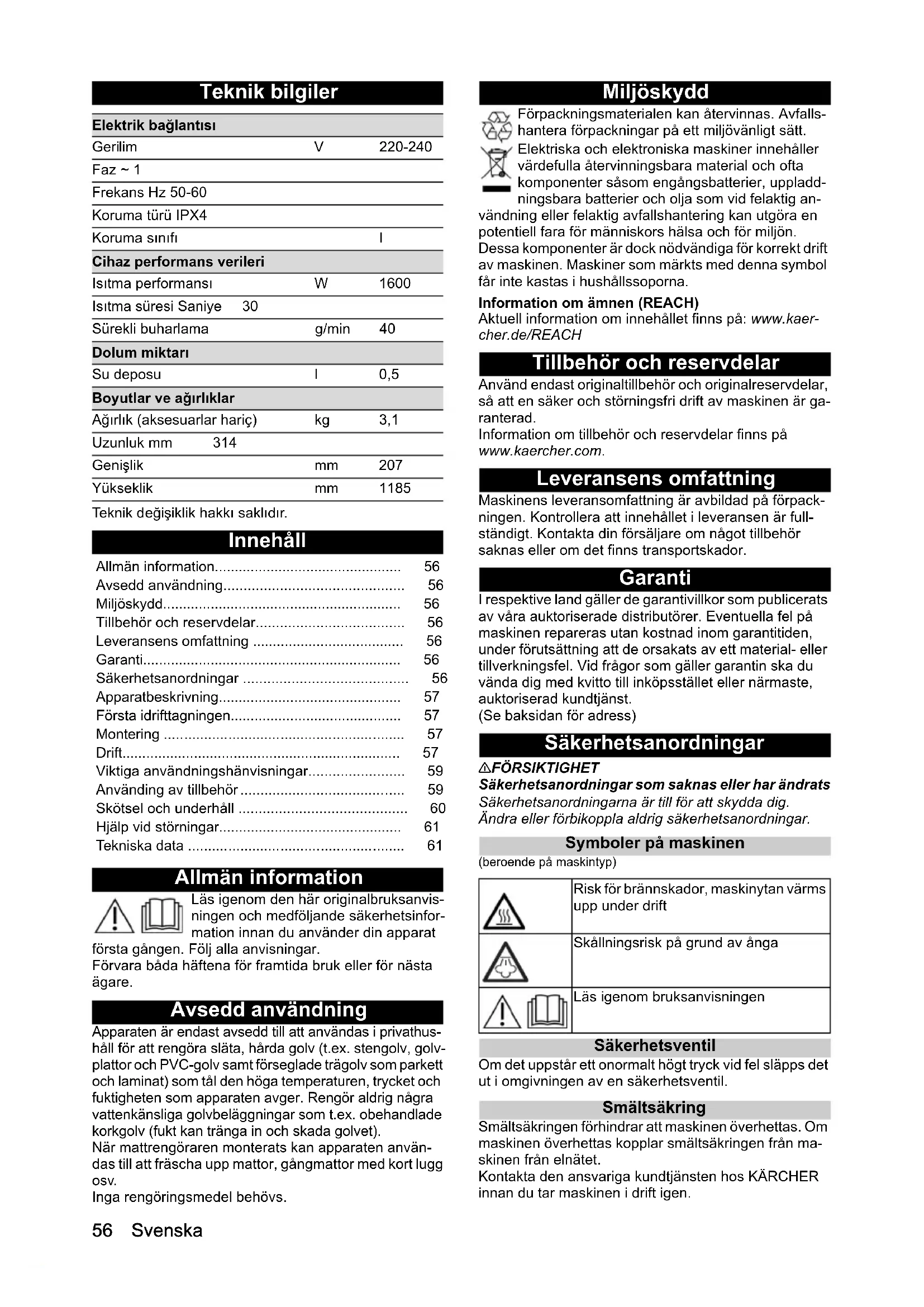 - °dH mmol/l Sinyal empülsü sayısı Sinyal empülsü aralığı I yumu- şak 0-7 0-1,3 1x 4 saniye II orta 7-14 1,3-2,5 2x III sert 14-21 2,5-3,8 3x IV çok sert >21 >3,8 4x56 Svenska Teknik bilgiler Teknik d eğişiklik hakkı saklıdır. Innehåll Allmän information Läs igenom den här originalbruksanvis- ningen och medföljande säkerhetsinfor- mation innan du använder din apparat första gången. Följ alla anvisningar. Förvara båda häftena för framtida bruk eller för nästa ägare. Avsedd användning Apparaten är endast avsedd till att användas i privathus- håll för att rengöra släta, hårda golv (t.ex. stengolv, golv- plattor och PVC-golv samt förseglade trägolv som parkett och laminat) som tål den höga temperaturen, trycket och fuktigheten som apparaten avger. Rengör aldrig några vattenkänsliga golvbeläggningar som t.ex. obehandlade korkgolv (fukt kan tränga in och skada golvet). När mattrengöraren monterats kan apparaten använ- das till att fräscha upp mattor, gångmattor med kort lugg osv. Inga rengöringsmedel behövs. Miljöskydd Förpackningsmaterialen kan återvinnas. Avfalls- hantera förpackningar på ett miljövänligt sätt. Elektriska och elektroniska maskiner innehåller värdefulla återvinningsbara material och ofta komponenter såsom engångsbatterier, uppladd- ningsbara batterier och olja som vid felaktig an- vändning eller felaktig avfallshantering kan utgöra en potentiell fara för människors hälsa och för miljön. Dessa komponenter är dock nödvändiga för korrekt drift av maskinen. Maskiner som märkts med denna symbol får inte kastas i hushållssoporna. Information om ämnen (REACH) Aktuell information om innehållet finns på: www.kaer- cher.de/REACH Tillbehör och reservdelar Använd endast originaltillbehör och originalreservdelar, så att en säker och störningsfri drift av maskinen är ga- ranterad. Information om tillbehör och reservdelar finns på www.kaercher.com. Leveransens omfattning Maskinens leveransomfattning är avbildad på förpack- ningen. Kontrollera att innehållet i leveransen är full- ständigt. Kontakta din försäljare om något tillbehör saknas eller om det finns transportskador. Garanti I respektive land gäller de garantivillkor som publicerats av våra auktoriserade distributörer. Eventuella fel på maskinen repareras utan kostnad inom garantitiden, under förutsättning att de orsakats av ett material- eller tillverkningsfel. Vid frågor som gäller garantin ska du vända dig med kvitto till inköpsstället eller närmaste, auktoriserad kundtjänst. (Se baksidan för adress) Säkerhetsanordningar 몇 FÖRSIKTIGHET Säkerhetsanordningar som saknas eller har ändrats Säkerhetsanordningarna är till för att skydda dig. Ändra eller förbikoppla aldrig säkerhetsanordningar. Symboler på maskinen (beroende på maskintyp) Säkerhetsventil Om det uppstår ett onormalt högt tryck vid fel släpps det ut i omgivningen av en säkerhetsventil. Smältsäkring Smältsäkringen förhindrar att maskinen överhettas. Om maskinen överhettas kopplar smältsäkringen från ma- skinen från elnätet. Kontakta den ansvariga kundtjänsten hos KÄRCHER innan du tar maskinen i drift igen. Elektrik bağlantısı Geri lim V 220-240 Faz ~ 1 Frekans Hz 50-60 Koruma türü IPX4 Koruma sınıfı I Cihaz performans verileri Isıtma performansı W 1600 Isıtma süresi Saniye 30 Sürekli buharlama g/min 40 Dolum miktarı Su deposu l 0,5 Boyutlar ve ağırlıklar Ağırlık (aksesuarlar hariç) kg 3,1 Uzunluk mm 314 Genişlik mm 207 Yükseklik mm 1185 Allmän information p. 56