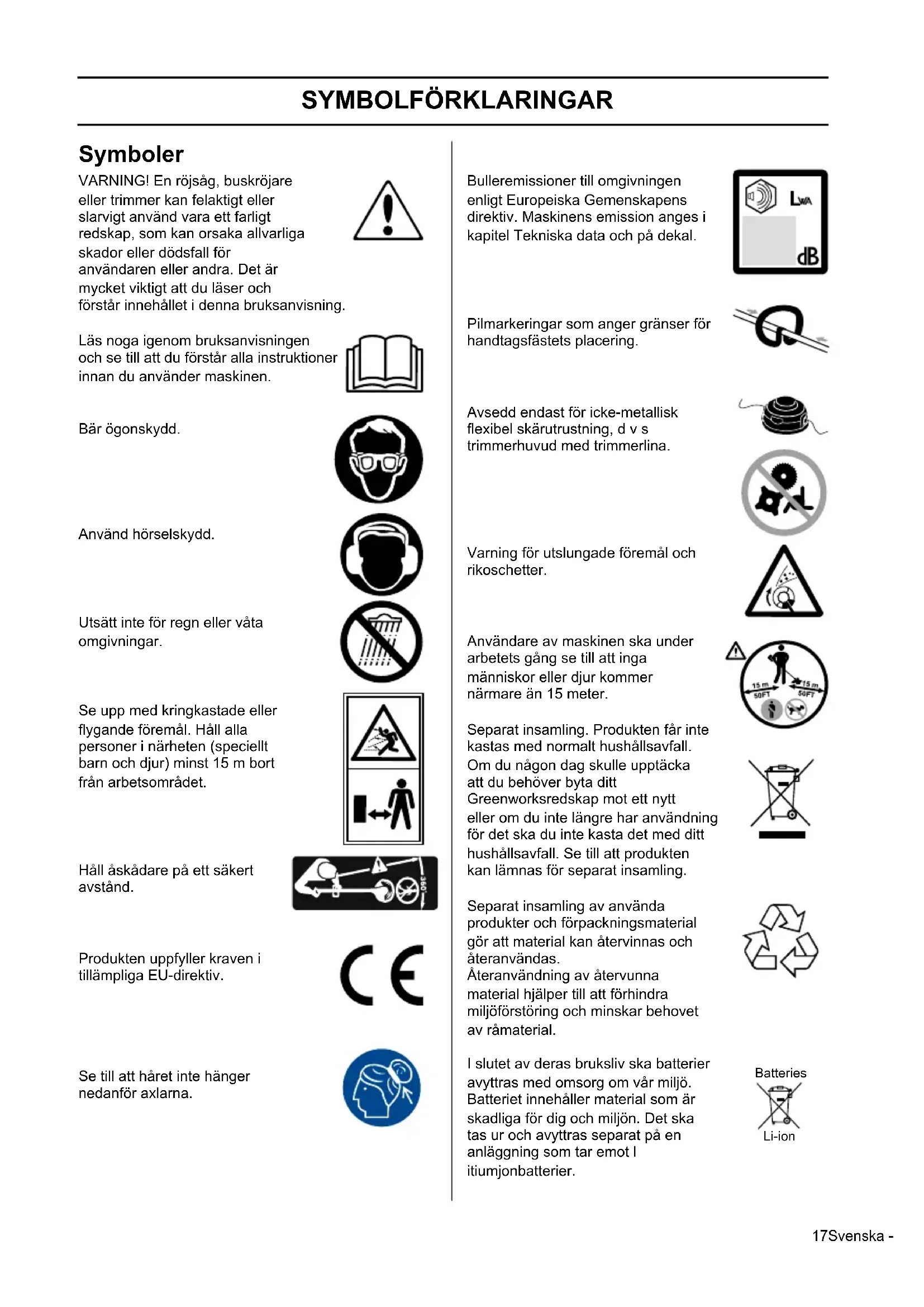 - the following (parts/clauses of) European harmonised standards have been used EN60335-1, EN 50636-2-91, EN ISO 3744, ISO 11094, EN 55014-1, EN 55014-2 A V Technology Ltd AVTECH House, Arkle Avenue, Stanley Green Trading, Estate, Handforth, Cheshire, SK9 3RW Measured sound power level 92.73 dB(A) Guaranteed sound power level 96 dB(A) Conformity assessment method to Annex VI/ Directive 2000/14/EC Place, date: Changzhou, 22/07/2016 Signature: Gary Gao Naixin (BEng, CEng, MIET) Vice president of Engineering17Svenska - SYMBOLFÖRKLARINGAR Symboler VARNING! En röjsåg, buskröjare eller trimmer kan felaktigt eller slarvigt använd vara ett farligt redskap, som kan orsaka allvarliga skador eller dödsfall för användaren eller andra. Det är mycket viktigt att du läser och förstår innehållet i denna bruksanvisning. Läs noga igenom bruksanvisningen och se till att du förstår alla instruktioner innan du använder maskinen. Bär ögonskydd. Använd hörselskydd. Utsätt inte för regn eller våta omgivningar. Se upp med kringkastade eller flygande föremål. Håll alla personer i närheten (speciellt barn och djur) minst 15 m bort från arbetsområdet. Håll åskådare på ett säkert avstånd. Produkten uppfyller kraven i tillämpliga EU-direktiv. Se till att håret inte hänger nedanför axlarna. Bulleremissioner till omgivningen enligt Europeiska Gemenskapens direktiv. Maskinens emission anges i kapitel Tekniska data och på dekal. Pilmarkeringar som anger gränser för handtagsfästets placering. Avsedd endast för icke-metallisk flexibel skärutrustning, d v s trimmerhuvud med trimmerlina. Varning för utslungade föremål och rikoschetter. Användare av maskinen ska under arbetets gång se till att inga människor eller djur kommer närmare än 15 meter. Separat insamling. Produkten får inte kastas med normalt hushållsavfall. Om du någon dag skulle upptäcka att du behöver byta ditt Greenworksredskap mot ett nytt eller om du inte längre har användning för det ska du inte kasta det med ditt hushållsavfall. Se till att produkten kan lämnas för separat insamling. Separat insamling av använda produkter och förpackningsmaterial gör att material kan återvinnas och återanvändas. Återanvändning av återvunna material hjälper till att förhindra miljöförstöring och minskar behovet av råmaterial. I slutet av deras bruksliv ska batterier avyttras med omsorg om vår miljö. Batteriet innehåller material som är skadliga för dig och miljön. Det ska tas ur och avyttras separat på en anläggning som tar emot l itiumjonbatterier. Batteries Li-ion18 - Svenska Innehåll SYMBOLFÖRKLARINGAR Symboler.................................................................... 17 INNEHÅLL Innehåll...................................................................... 18 Innan start måste följande observeras: ...................... 18 VAD ÄR VAD? Vad är vad på kanttrimmern?..................................... 19