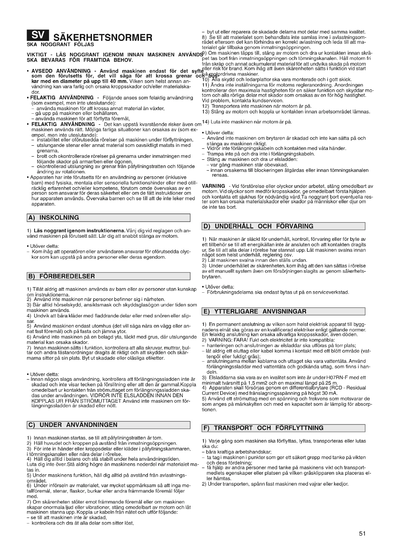 AVSEDD ANVÄNDNING - Använd maskinen endast för det syfte som den förutsetts för, det vill säga för att krossa grenar och bus-
