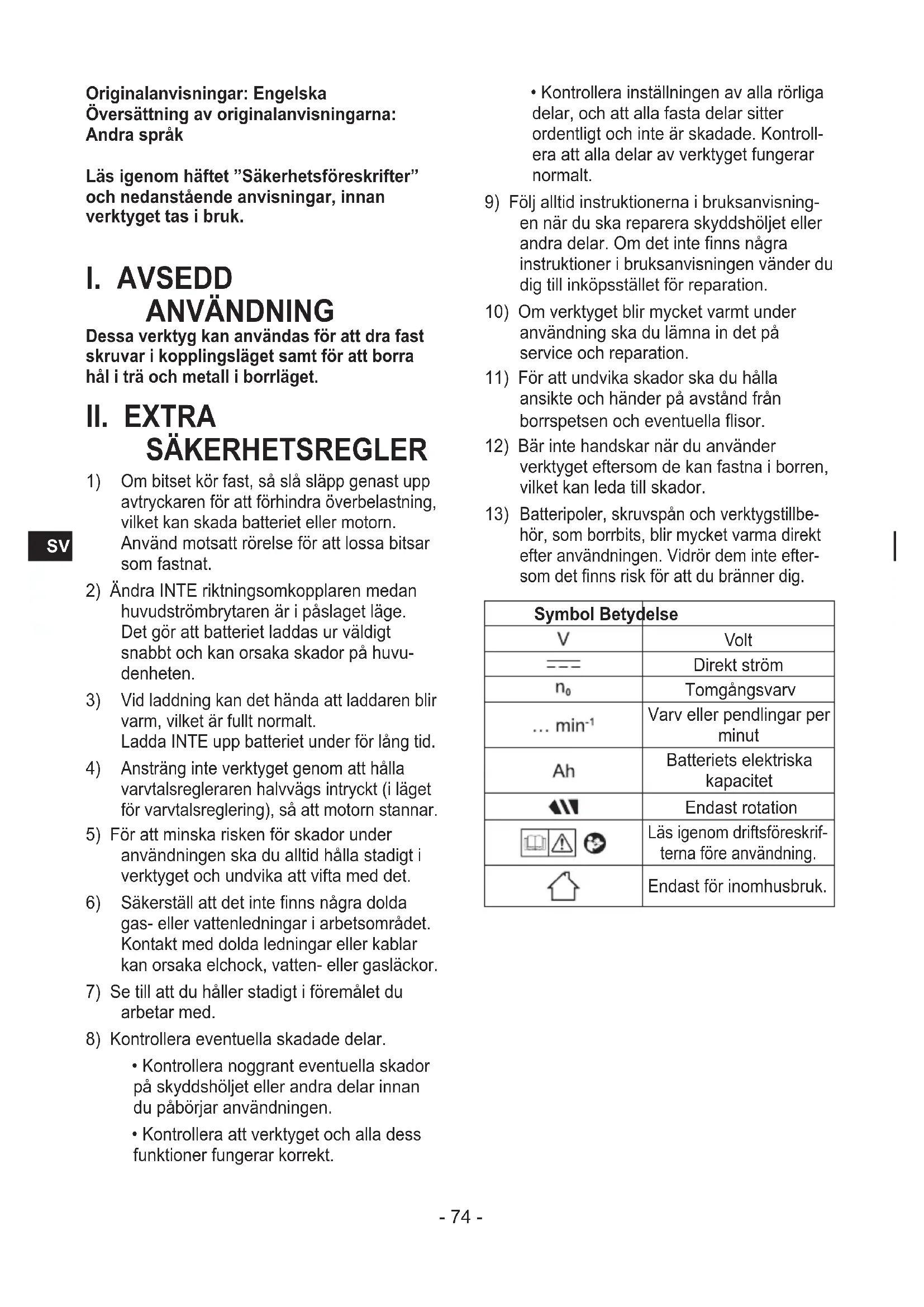 verktyget eftersom de kan fastna i borren, vilket kan leda till skador. 13) Batteripoler, skruvspån och verktygstillbe- hör, som borrbits, blir mycket varma direkt efter användningen. Vidrör dem inte efter- som det nns risk för att du bränner dig. Symbol Betydelse Volt Direkt ström Tomgångsvarv Varv eller pendlingar per minut Batteriets elektriska kapacitet Endast rotation Läs igenom driftsföreskrif- terna före användning. Endast för inomhusbruk.- 75 -