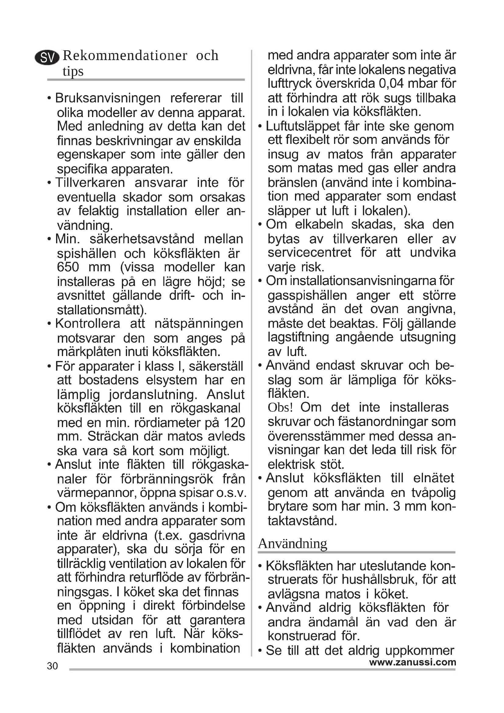 - Se till att det aldrig uppkommer SV31 www.zanussi.com höga lågor under köksäkten när den är igång.