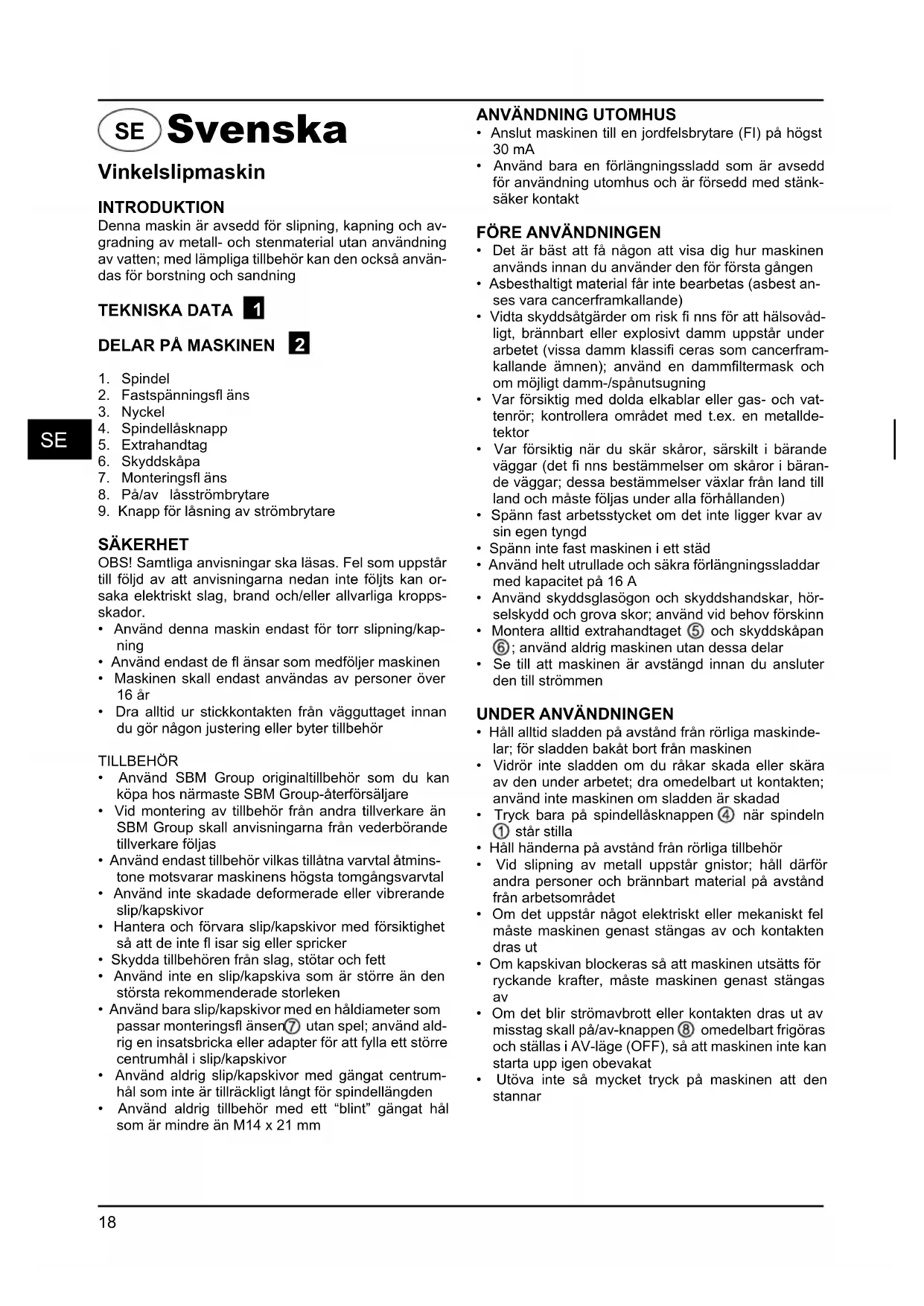 - Använd endast de fl änsar som medföljer maskinen• Maskinen skall endast användas av personer över 16 år• Dra alltid ur stickkontakten från vägguttaget innan du gör någon justering eller byter tillbehörTILLBEHÖR• Använd SBM Group originaltillbehör som du kan köpa hos närmaste SBM Group-återförsäljare• Vid montering av tillbehör från andra tillverkare än SBM Group skall anvisningarna från vederbörande tillverkare följas• Använd endast tillbehör vilkas tillåtna varvtal åtmins-tone motsvarar maskinens högsta tomgångsvarvtal• Använd inte skadade deformerade eller vibrerande slip/kapskivor• Hantera och förvara slip/kapskivor med försiktighet så att de inte fl isar sig eller spricker• Skydda tillbehören från slag, stötar och fett• Använd inte en slip/kapskiva som är större än den största rekommenderade storleken• Använd bara slip/kapskivor med en håldiameter som passar monteringsfl änsen utan spel; använd ald-rig en insatsbricka eller adapter för att fylla ett större centrumhål i slip/kapskivor• Använd aldrig slip/kapskivor med gängat centrum-hål som inte är tillräckligt långt för spindellängden• Använd aldrig tillbehör med ett “blint” gängat hål som är mindre än M14 x 21 mm