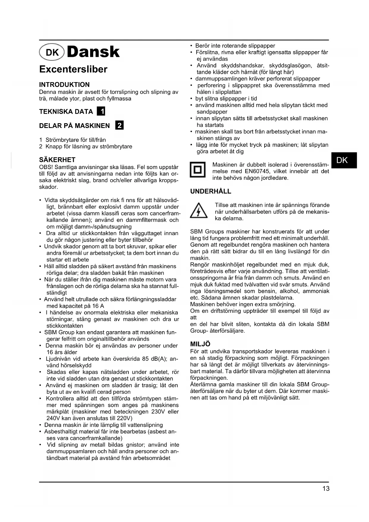 Excentersliber INTRODUKTIONDenna maskin är avsett för torrslipning och slipning av trä, målade ytor, plast och fyllmassaTEKNISKA DATA 1 DELAR PÅ MASKINEN 2 1 Strömbrytare för till/från2 Knapp för låsning av strömbrytareSÄKERHETOBS! Samtliga anvisningar ska läsas. Fel som uppstår till följd av att anvisningarna nedan inte följts kan or-saka elektriskt slag, brand och/eller allvarliga kropps-skador. • Vidta skyddsåtgärder om risk fi nns för att hälsovåd-ligt, brännbart eller explosivt damm uppstår under arbetet (vissa damm klassifi ceras som cancerfram- kallande ämnen); använd en dammfi ltermask och om möjligt damm-/spånutsugning• Dra alltid ur stickkontakten från vägguttaget innan du gör någon justering eller byter tillbehör• Undvik skador genom att ta bort skruvar, spikar eller andra föremål ur arbetsstycket; ta dem bort innan du startar ett arbete• Håll alltid sladden på säkert avstånd från maskinens rörliga delar; dra sladden bakåt från maskinen• När du ställer ifrån dig maskinen måste motorn vara frånslagen och de rörliga delarna ska ha stannat full-ständigt• Använd helt utrullade och säkra förlängningssladdar med kapacitet på 16 A• I händelse av onormala elektriska eller mekaniska störningar, stäng genast av maskinen och dra ur stickkontakten• SBM Group kan endast garantera att maskinen fun-gerar felfritt om originaltillbehör används• Denna maskin bör ej användas av personer under 16 års ålder• Ljudnivån vid arbete kan överskrida 85 dB(A); an-vänd hörselskydd• Skadas eller kapas nätsladden under arbetet, rör inte vid sladden utan dra genast ut stickkontakten• Använd ej maskinen om sladden är trasig; låt den byta ut av en kvalifi cerad person• Kontrollera alltid att den tillförda strömtypen stäm-mer med spänningen som anges på maskinens märkplåt (maskiner med beteckningen 230V eller 240V kan även anslutas till 220V)• Denna maskin är inte lämplig till vattenslipning• Asbesthaltigt material får inte bearbetas (asbest an-ses vara cancerframkallande)• Vid slipning av metall bildas gnistor; använd inte dammuppsamlaren och håll andra personer och an-tändbart material på avstånd från arbetsområdet• Berör inte roterande slippapper• Förslitna, rivna eller kraftigt igensatta slippapper får ej användas• Använd skyddshandskar, skyddsglasögon, åtsit-tande kläder och hårnät (för långt här)• dammuppsamlingen kräver perforerat slippapper• perforering i slippappret ska överensstämma med hålen i slipplattan• byt slitna slippapper i tid• använd maskinen alltid med hela slipytan täckt med sandpapper• innan slipytan sätts till arbetsstycket skall maskinen ha startats• maskinen skall tas bort från arbetsstycket innan ma-skinen stängs av• lägg inte för mycket tryck på maskinen; låt slipytan göra arbetet åt digMaskinen är dubbelt isolerad i överensstäm-melse med EN60745, vilket innebär att det inte behövs någon jordledare. UNDERHÅLLTillse att maskinen inte är spännings förande när underhållsarbeten utförs på de mekanis-ka delarna. SBM Groups maskiner har konstruerats för att under lång tid fungera problemfritt med ett minimalt underhåll. Genom att regelbundet rengöra maskinen och hantera den på rätt sätt bidrar du till en lång livslängd för din maskin.Rengör maskinhöljet regelbundet med en mjuk duk, företrädesvis efter varje användning. Tillse att ventilati-onsspringorna är fria från damm och smuts. Använd en mjuk duk fuktad med tvålvatten vid svår smuts. Använd inga lösningsmedel som bensin, alkohol, ammoniak etc. Sådana ämnen skadar plastdelarna.Maskinen behöver ingen extra smörjning.Om en driftstörning uppträder till exempel till följd av att en del har blivit sliten, kontakta då din lokala SBM Group- återförsäljare.MILJÖFör att undvika transportskador levereras maskinen i en så stadig förpackning som möjligt. Förpackningen har så långt det är möjligt tillverkats av återvinnings-bart material. Ta därför tillvara möjligheten att återvinna förpackningen.Återlämna gamla maskiner till din lokala SBM Group-återförsäljare när du byter ut dem. Där kommer maski-nen att tas om hand på ett miljövänligt sätt.