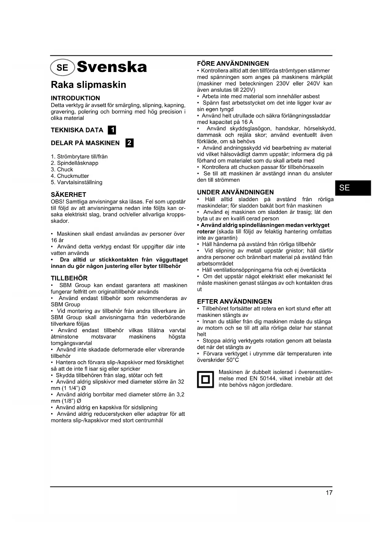 Maskinen ar dubbelt isolerad i overensstammelse med EN 50144, vilketinnebar att det inte beho's nagon jordledare.