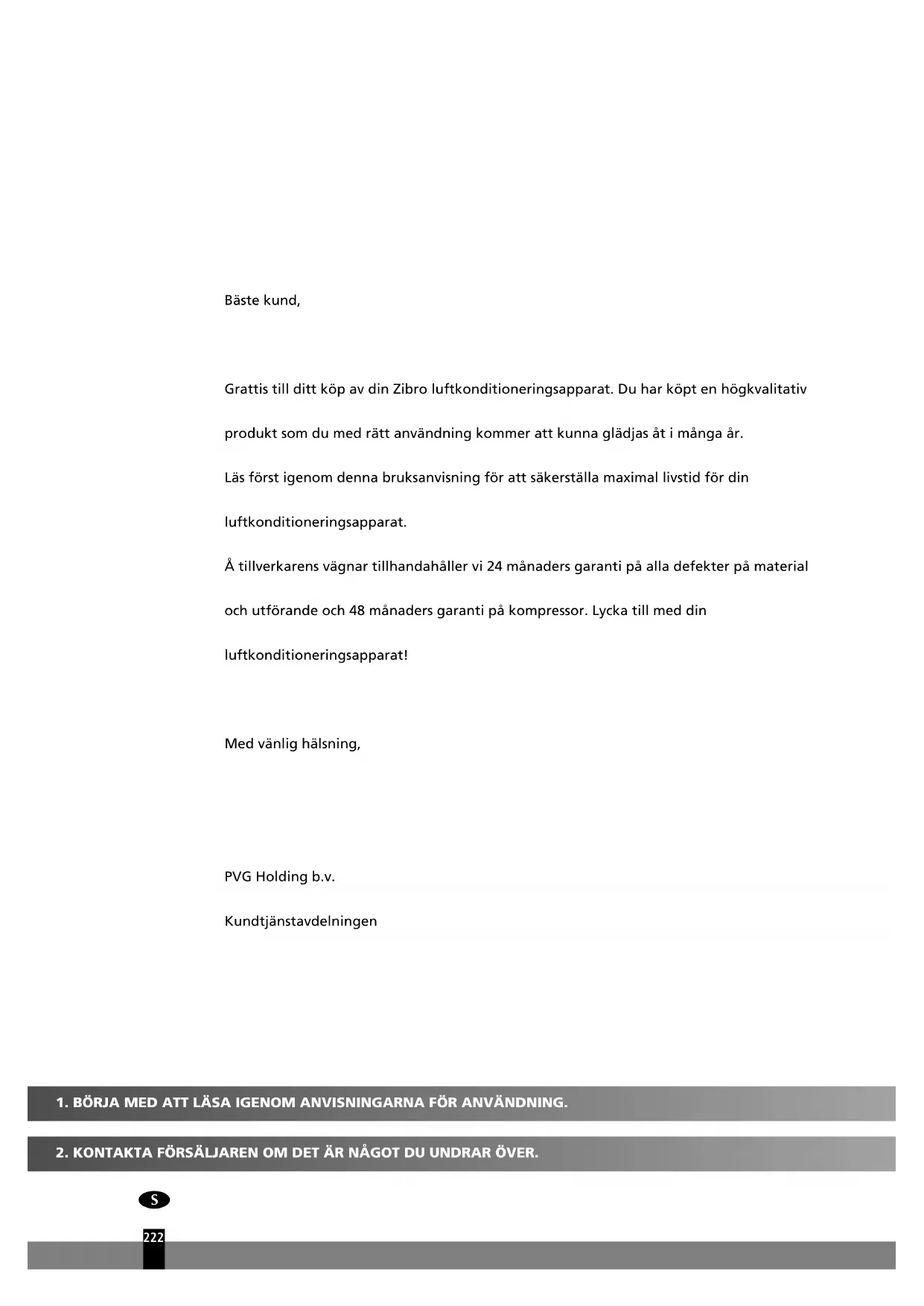 L GARANTIVILLKOR Luftkonditioneringsapparaten har en 48 månaders garanti på kompressor och 24 månaders garanti på andra delar, som gäller från och med inköpsdatumet. Följande bestämmelser gäller: