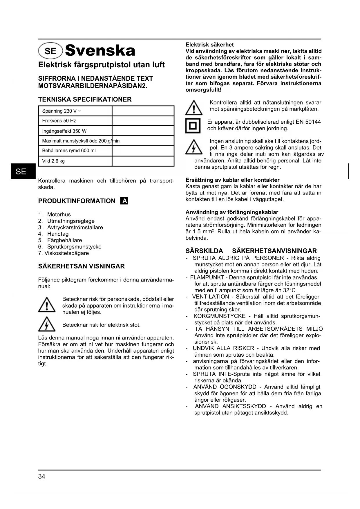 Följande piktogram förekommer i denna användarma- nual: Betecknar risk för personskada, dödsfall eller skada på apparaten om instruktionerna i ma- nualen ej följes. Betecknar risk för elektrisk stöt. Läs denna manual noga innan ni använder apparaten. Försäkra er om att ni vet hur maskinen fungerar och hur man ska använda den. Underhåll apparaten enligt instruktionerna för att säkerställa att den fungerar rik- tigt. Elektrisk säkerhet Vid användning av elektriska maski ner, iaktta alltid de säkerhetsföreskrifter som gäller lokalt i sam- band med brandfara, fara för elektriska stötar och kroppsskada. Läs förutom nedanstående instruk- tioner även igenom bladet med säkerhetsföreskrif- ter som bifogas separat. Förvara instruktionerna omsorgsfullt! Kontrollera alltid att nätanslutningen svarar mot spänningsbeteckningen på märkplåten. Er apparat är dubbelisolerad enligt EN 50144 och kräver därför ingen jordning. Ingen anslutning skall ske till kontaktens jord- pol. En 3 ampere säkring skall anslutas. Det fi nns inga delar inuti som kan åtgärdas av användaren. Anlita alltid behörig personal. Låt inte denna sprutpistol utsättas för regn. Ersättning av kablar eller kontakter Kasta genast gam la kablar eller kontakter när de har bytts ut mot nya. Det är förenat med fara att sätta in kontakten till en lös kabel i vägguttaget. Användning av förlängningskablar Använd endast godkänd förlängningskabel för appa- ratens strömförsörjning. Minimistorleken för ledningen är 1.5 mm