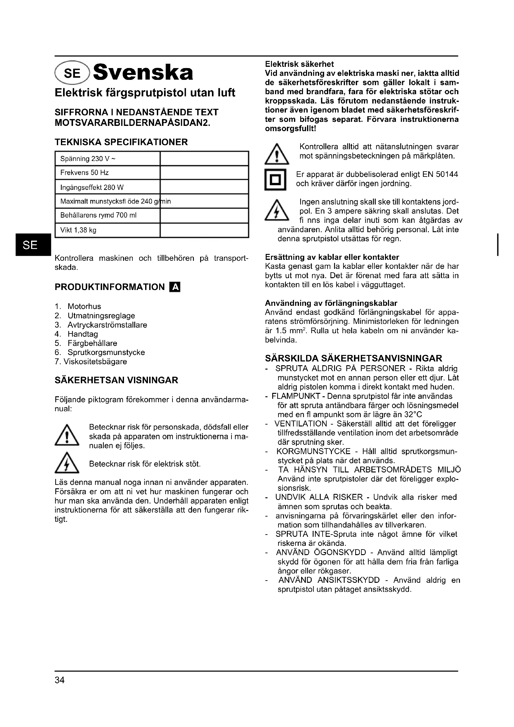 - STÄNG AV STRÖMTILLFÖRSELN- Stäng alltid av strömtillförseln;när ni fyller färgbehällaren eller ren-gör sprutpistolen.