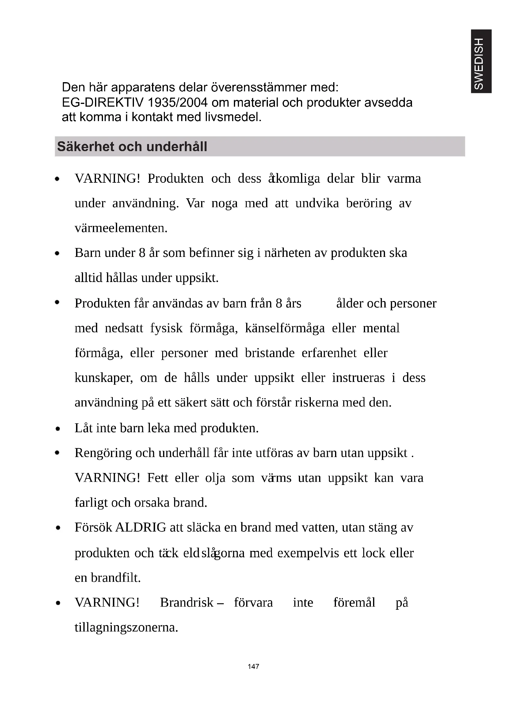 VARNING: använd endast hällskydd som konstruerats av apparatens tillverkare eller som anges som lämpliga av apparatens tillverkare i bruksanvisningen eller hällskydd som ingår i apparaten. En användning av olämpliga skydd kan leda till olyckor.