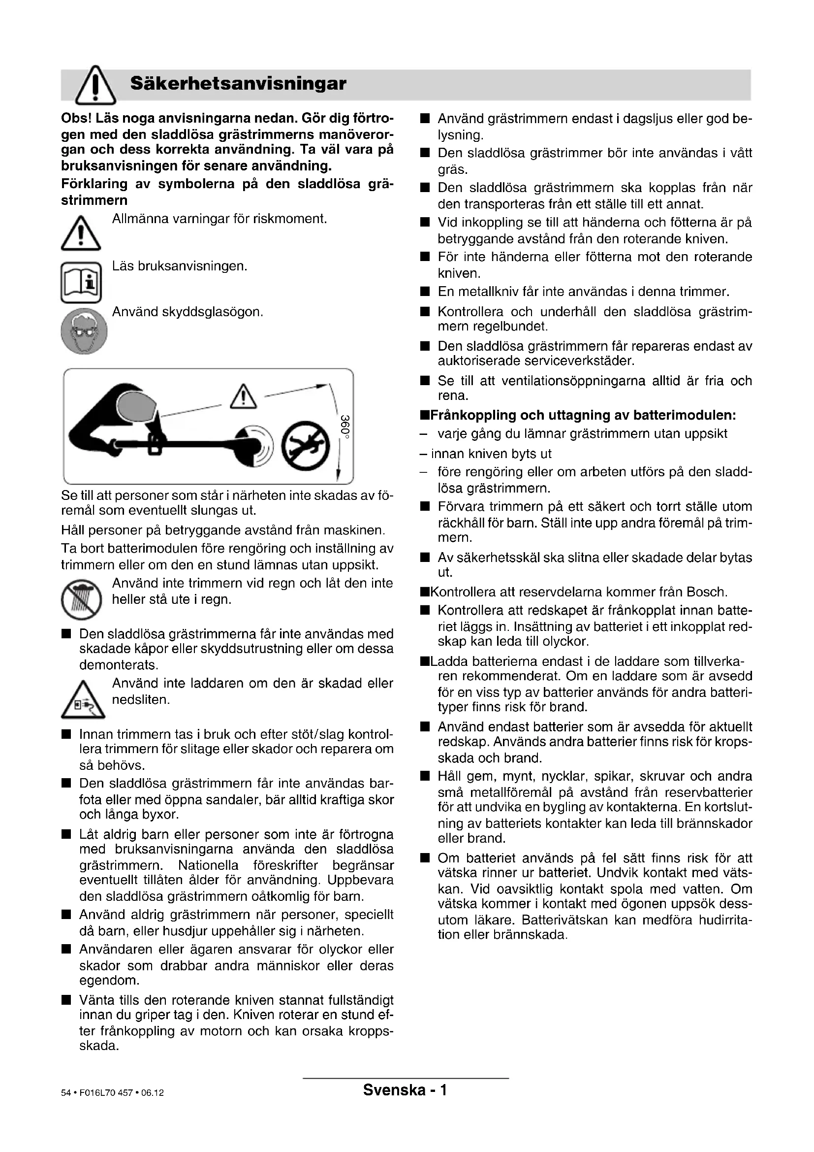 Ret til ændringer forbeholdes Bortskaffelse Service Overensstemmelseserklæring F016L70 457.book Seite 6 Montag, 18. Dezember 2006 9:45 09 53 • F016L70 457 • 06.12Svenska - 1 Obs! Läs noga anvisningarna nedan. Gör dig förtro- gen med den sladdlösa grästrimmerns manöveror- gan och dess korrekta användning. Ta väl vara på bruksanvisningen för senare användning. Förklaring av symbolerna på den sladdlösa grä- strimmern Allmänna varningar för riskmoment. Läs bruksanvisningen. Använd skyddsglasögon. Se till att personer som står i närheten inte skadas av fö- remål som eventuellt slungas ut. Håll personer på betryggande avstånd från maskinen. Ta bort batterimodulen före rengöring och inställning av trimmern eller om den en stund lämnas utan uppsikt. Använd inte trimmern vid regn och låt den inte heller stå ute i regn. ■ Den sladdlösa grästrimmerna får inte användas med skadade kåpor eller skyddsutrustning eller om dessa demonterats. Använd inte laddaren om den är skadad eller nedsliten. ■ Innan trimmern tas i bruk och efter stöt/slag kontrol- lera trimmern för slitage eller skador och reparera om så behövs. ■ Den sladdlösa grästrimmern får inte användas bar- fota eller med öppna sandaler, bär alltid kraftiga skor och långa byxor. ■ Låt aldrig barn eller personer som inte är förtrogna med bruksanvisningarna använda den sladdlösa grästrimmern. Nationella föreskrifter begränsar eventuellt tillåten ålder för användning. Uppbevara den sladdlösa grästrimmern oåtkomlig för barn. ■ Använd aldrig grästrimmern när personer, speciellt då barn, eller husdjur uppehåller sig i närheten. ■ Användaren eller ägaren ansvarar för olyckor eller skador som drabbar andra människor eller deras egendom. ■ Vänta tills den roterande kniven stannat fullständigt innan du griper tag i den. Kniven roterar en stund ef- ter frånkoppling av motorn och kan orsaka kropps- skada. ■ Använd grästrimmern endast i dagsljus eller god be- lysning. ■ Den sladdlösa grästrimmer bör inte användas i vått gräs. ■ Den sladdlösa grästrimmern ska kopplas från när den transporteras från ett ställe till ett annat. ■ Vid inkoppling se till att händerna och fötterna är på betryggande avstånd från den roterande kniven. ■ För inte händerna eller fötterna mot den roterande kniven. ■ En metallkniv får inte användas i denna trimmer. ■ Kontrollera och underhåll den sladdlösa grästrim- mern regelbundet. ■ Den sladdlösa grästrimmern får repareras endast av auktoriserade serviceverkstäder. ■ Se till att ventilationsöppningarna alltid är fria och rena. ■ Frånkoppling och uttagning av batterimodulen: – varje gång du lämnar grästrimmern utan uppsikt – innan kniven byts ut – före rengöring eller om arbeten utförs på den sladd- lösa grästrimmern. ■ Förvara trimmern på ett säkert och torrt ställe utom räckhåll för barn. Ställ inte upp andra föremål på trim- mern. ■ Av säkerhetsskäl ska slitna eller skadade delar bytas ut. ■ Kontrollera att reservdelarna kommer från Bosch. ■ Kontrollera att redskapet är frånkopplat innan batte- riet läggs in. Insättning av batteriet i ett inkopplat red- skap kan leda till olyckor. ■ Ladda batterierna endast i de laddare som tillverka- ren rekommenderat. Om en laddare som är avsedd för en viss typ av batterier används för andra batteri- typer finns risk för brand. ■ Använd endast batterier som är avsedda för aktuellt redskap. Används andra batterier finns risk för krops- skada och brand. ■ Håll gem, mynt, nycklar, spikar, skruvar och andra små metallföremål på avstånd från reservbatterier för att undvika en bygling av kontakterna. En kortslut- ning av batteriets kontakter kan leda till brännskador eller brand. ■ Om batteriet används på fel sätt finns risk för att vätska rinner ur batteriet. Undvik kontakt med väts- kan. Vid oavsiktlig kontakt spola med vatten. Om vätska kommer i kontakt med ögonen uppsök dess- utom läkare. Batterivätskan kan medföra hudirrita- tion eller brännskada. Säkerhetsanvisningar 360° F016L70 457.book Seite 1 Montag, 18. Dezember 2006 9:45 09 54 • F016L70 457 • 06.12Svenska - 2 Grästrimmern är avsedd för trimning av gräs och ogräs under buskar samt på slänter och vid kanter som inte kan nås med gräsklipparen. Grästrimmern kan användas vid en omgivningstem- peratur mellan 0 °C och 40 °C. Denna instruktionsbok lämnar anvisningar för kor- rekt montage och säker användning av din gräs- trimmer. Det är viktigt att du noggrant läser igenom anvisningarna. Plocka försiktigt upp grästrimmen ur förpackningen och kontrollera att följande delar finns med: – Trimmer – Skyddsskärm – Skärtallrik – Kniv – Laddningsaggregat – Bruksanvisning Saknas delar eller är de skadade ta genast kontakt med din återförsäljare. 1 Strömställare Till/Från 2 Handtag 3 Styrhandtag 4 Skaftets övre del 5 Skaftets undre del 6 Trimmerhuvud 7 Ventilationsöppningar 8 Skyddsskärm 9 Batterimodul 10 Laddare 11 Batteriladdningsschakt 12 LED-indikator 13 Stickpropp** 14 Serienummer **krav i vissa land I bruksanvisningen avbildat och beskrivet tillbehör ingår inte alltid i leveransen! Tekniska data Sladdlös grästrimmer ART 23 EASYTRIM ACCU/
