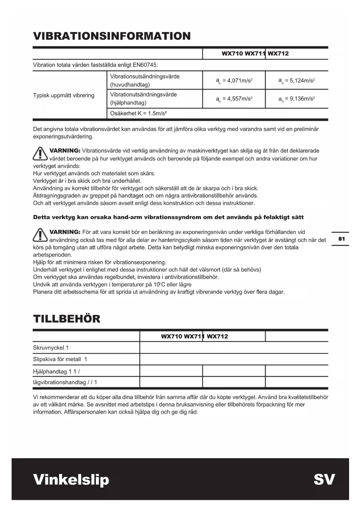 C eller lägre Planera ditt arbetsschema för att sprida ut användning av kraftigt vibrerande verktyg över era dagar. TILLBEHÖR WX710 WX711 WX712 Skruvnyckel 1 Slipskiva för metall 1 Hjälphandtag 1 1 / lågvibrationshandtag / / 1 Vi rekommenderar att du köper alla dina tillbehör från samma affär där du köpte verktyget. Använd bra kvalitetstillbehör av ett välkänt märke. Se avsnittet med arbetstips i denna bruksanvisning eller tillbehörets förpackning för mer information. Affärspersonalen kan också hjälpa dig och ge dig råd.Vinkelslip SV