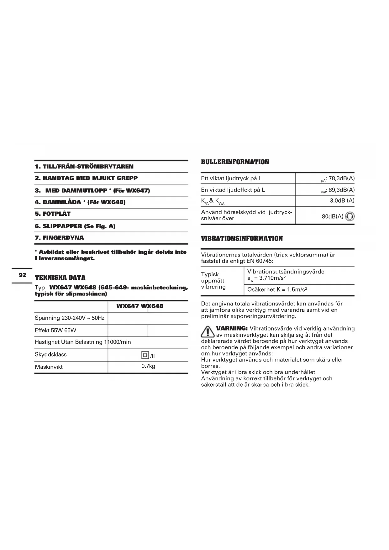 - Avbildat eller beskrivet tillbehör ingår delvis inte I leveransomfånget. TEKNISKA DATA Typ WX647 WX648 (645-649- maskinbeteckning, typisk för slipmaskinen) WX647 WX648 Spänning 230-240V ~ 50Hz Effekt 55W 65W Hastighet Utan Belastning 11000/min Skyddsklass /ll Maskinvikt 0.7kg BULLERINFORMATION Ett viktat ljudtryck på L