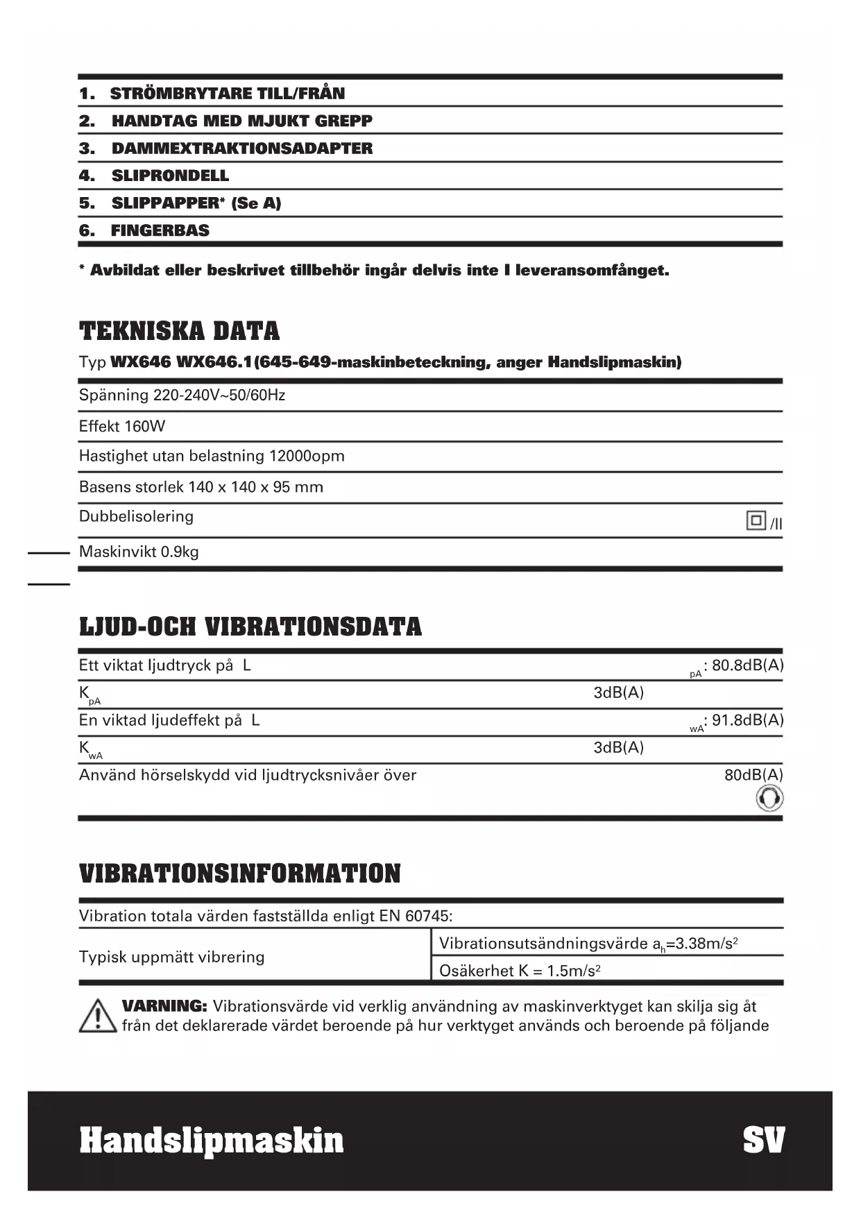 - Avbildat eller beskrivet tillbehör ingår delvis inte I leveransomfånget. Spänning 220-240V~50/60Hz Effekt 160W Hastighet utan belastning 12000opm Basens storlek 140 x 140 x 95 mm Dubbelisolering /ll Maskinvikt 0.9kg TEKNISKA DATA Typ WX646 WX646.1(645-649-maskinbeteckning, anger Handslipmaskin) LJUD-OCH VIBRATIONSDATA Ett viktat ljudtryck på L