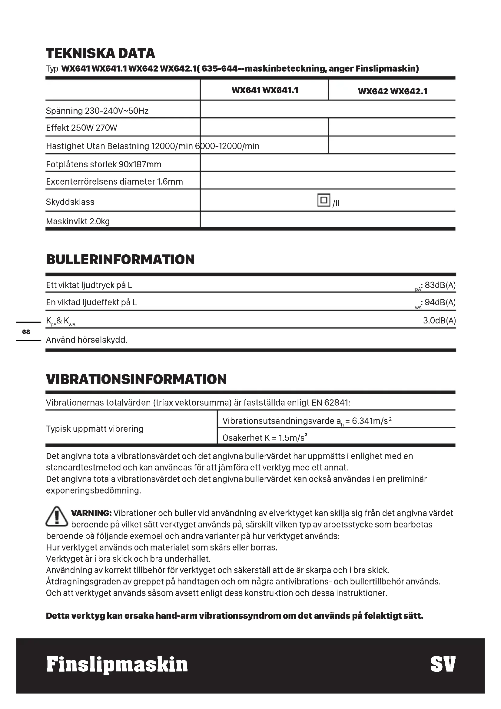 - Avbildat eller beskrivet tillbehör ingår delvis inte I leveransomfånget.68 Finslipmaskin SV TEKNISKA DATA Typ WX641 WX641.1 WX642 WX642.1( 635-644--maskinbeteckning, anger Finslipmaskin) WX641 WX641.1 WX642 WX642.1 Spänning 230-240V~50Hz Effekt 250W 270W Hastighet Utan Belastning 12000/min 6000-12000/min Fotplåtens storlek 90x187mm Excenterrörelsens diameter 1.6mm Skyddsklass /ll Maskinvikt 2.0kg BULLERINFORMATION Ett viktat ljudtryck på L