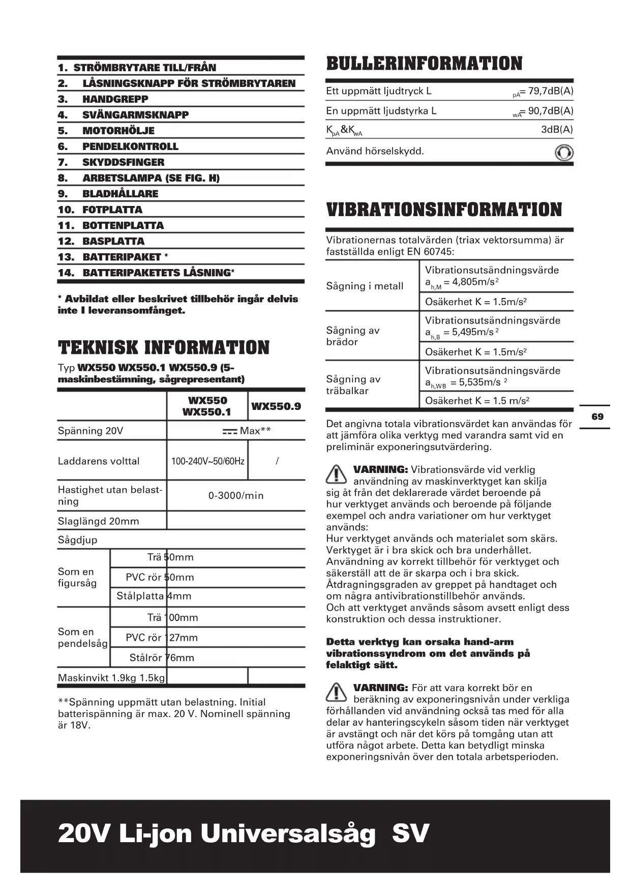 C eller lägre Planera ditt arbetsschema för att sprida ut användning av kraftigt vibrerande verktyg över flera dagar. TILLBEHÖR WX550 WX550.1 WX550.9 1 timme Laddning (WA3860) 1 1 / 2Ah Litiumbatteri (WA3551.1) 1 2 / Sågblad för trä
