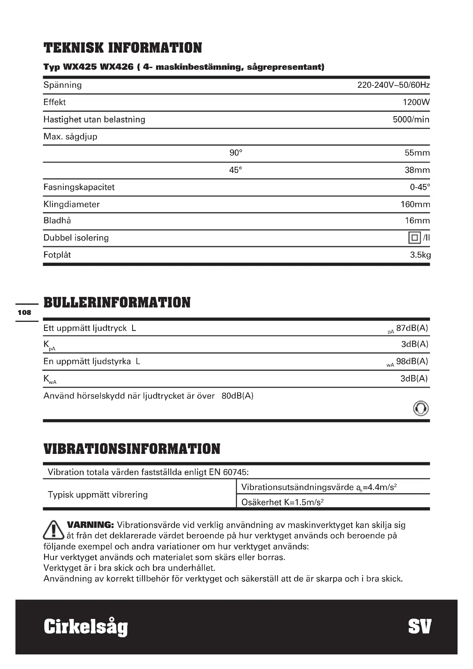 TEKNISK INFORMATION Typ WX425 WX426 ( 4- maskinbestämning, sågrepresentant) BULLERINFORMATION Ett uppmätt ljudtryck L