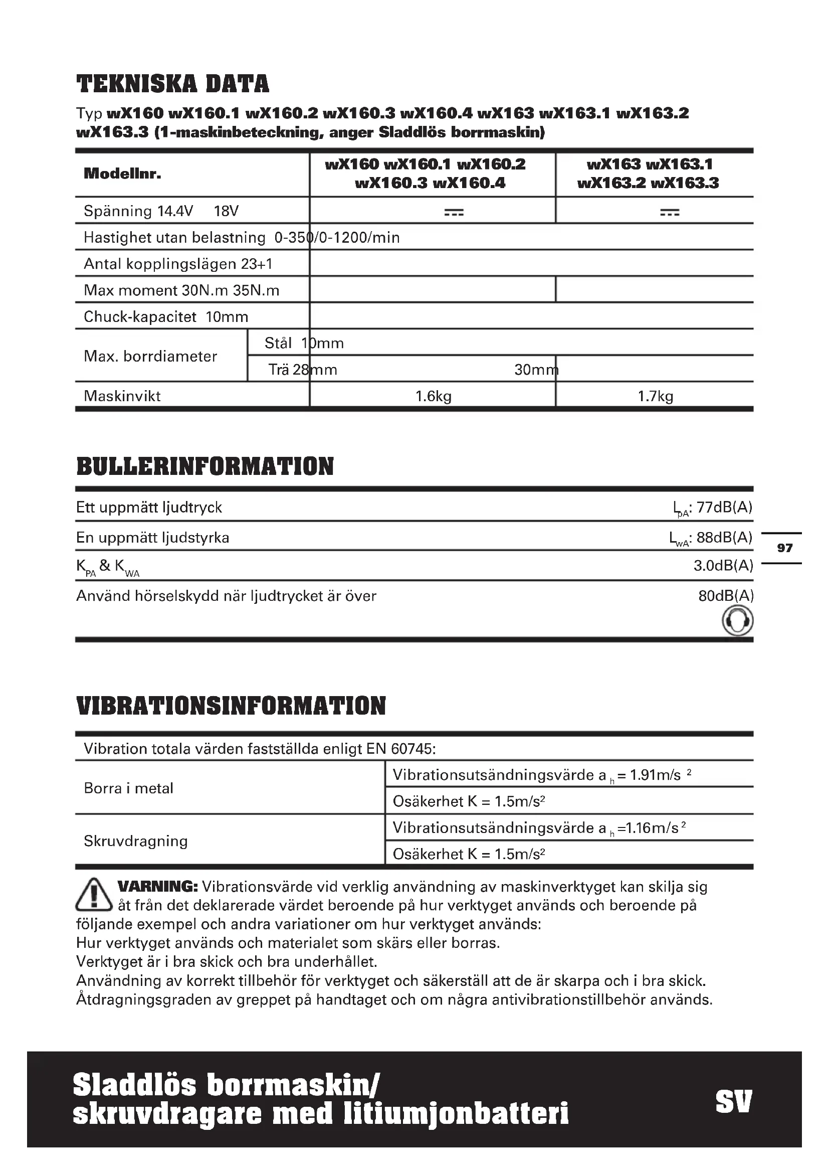 Osäkerhet K = 1.5m/s² VARNING: Vibrationsvärde vid verklig användning av maskinverktyget kan skilja sig åt från det deklarerade värdet beroende på hur verktyget används och beroende på följande exempel och andra variationer om hur verktyget används: Hur verktyget används och materialet som skärs eller borras. Verktyget är i bra skick och bra underhållet. Användning av korrekt tillbehör för verktyget och säkerställ att de är skarpa och i bra skick. Åtdragningsgraden av greppet på handtaget och om några antivibrationstillbehör används.98 Sladdlös borrmaskin/ skruvdragare med litiumjonbatteri
