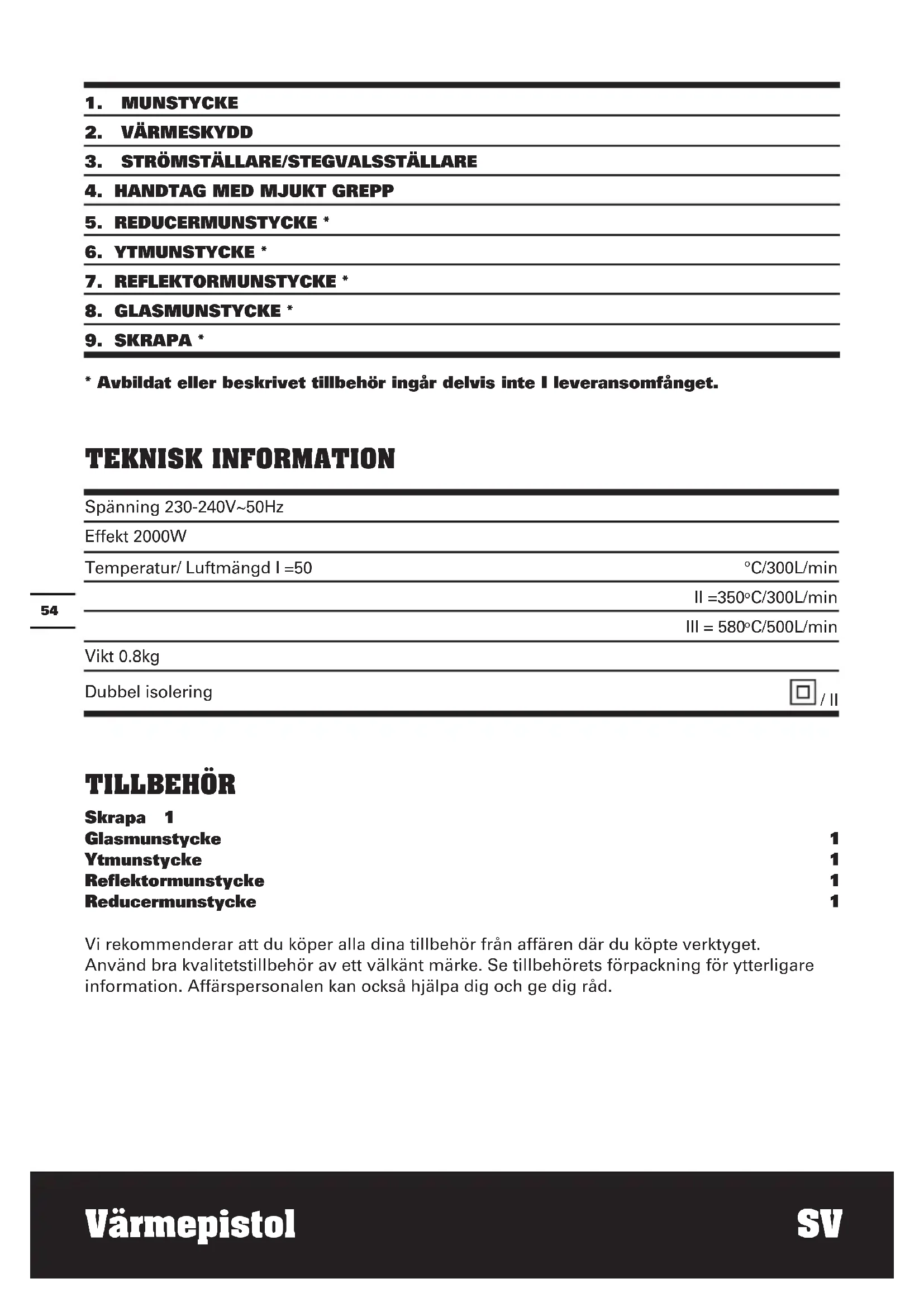 C/500L/min Vikt 0.8kg Dubbel isolering / II TILLBEHÖR Skrapa 1 Glasmunstycke 1 Ytmunstycke 1 Reflektormunstycke 1 Reducermunstycke 1 Vi rekommenderar att du köper alla dina tillbehör från affären där du köpte verktyget. Använd bra kvalitetstillbehör av ett välkänt märke. Se tillbehörets förpackning för ytterligare information. Affärspersonalen kan också hjälpa dig och ge dig råd.Värmepistol SV