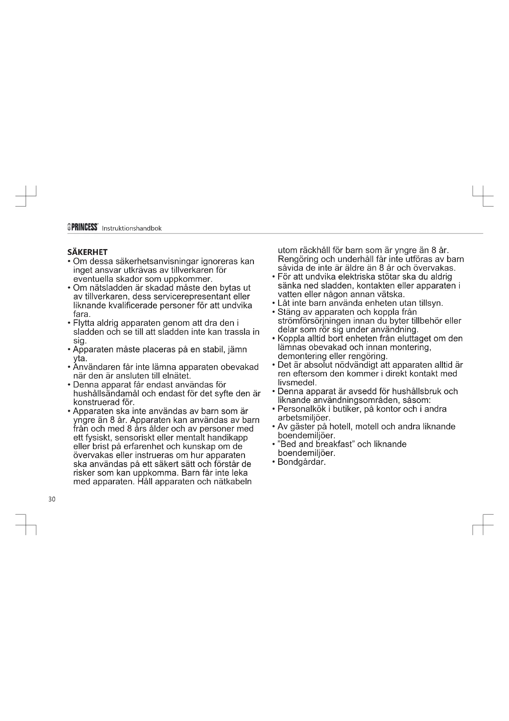 - Trycksektionen på handtaget kan lätt demonteras för rengöring. OMGIVNING Denna apparat ska ej slängas bland vanligt hushållsavfall när den slutat fungera. Den ska slängas vid en återvinningsstation för elektriskt och elektroniskt hushållsavfall. Denna symbol på apparaten, bruksanvisningen och förpackningen gör dig uppmärksam på detta. Materialen som används i denna apparat kan återvinnas. Genom att återvinna hushållsapparater gör du en viktig insats för att skydda vår miljö. Fråga de lokala myndigheterna var det finns insamlingsställen. Support Du hittar all tillgänglig information och reservdelar på www.princesshome.eu!Instrukcje użytkowania