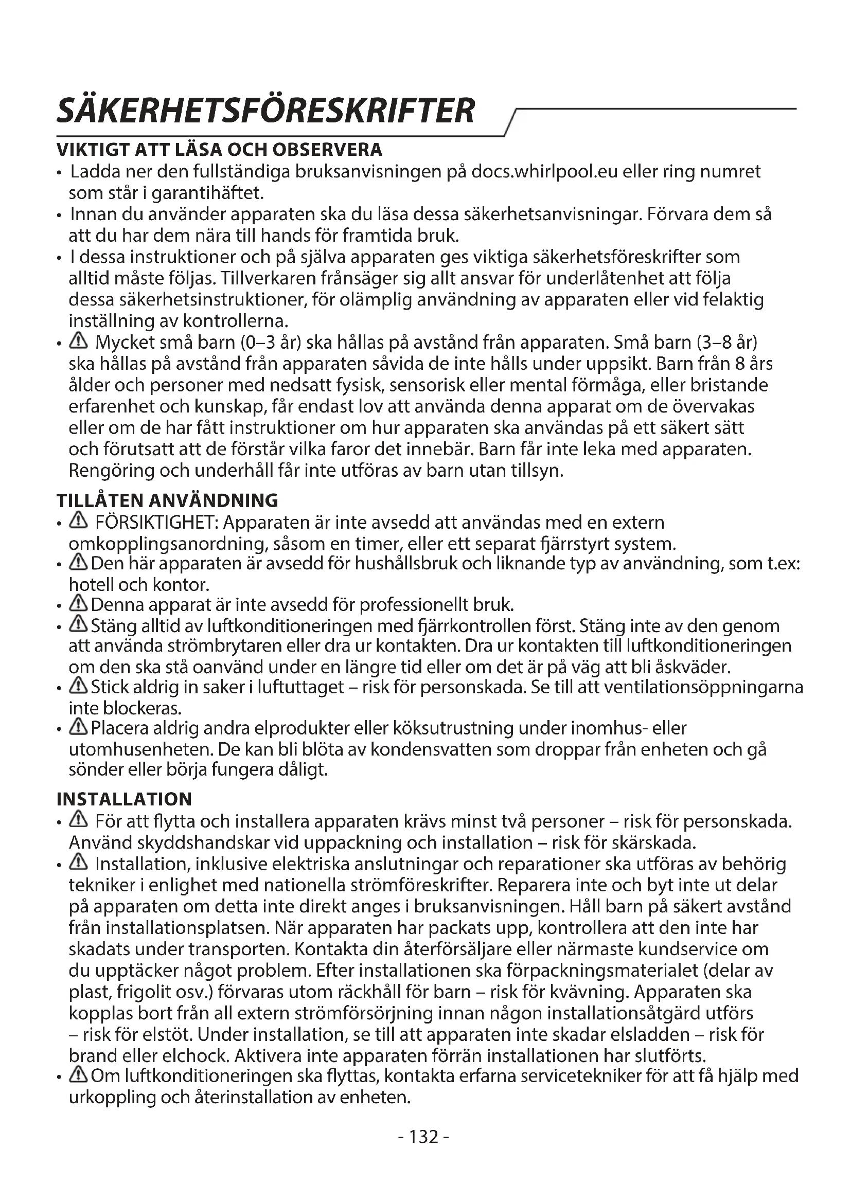 - Ladda ner den fullständiga instruktionsboken för detaljerad information om installation, service, underhåll och reparationsmetoder på docs.whirlpool.eu.