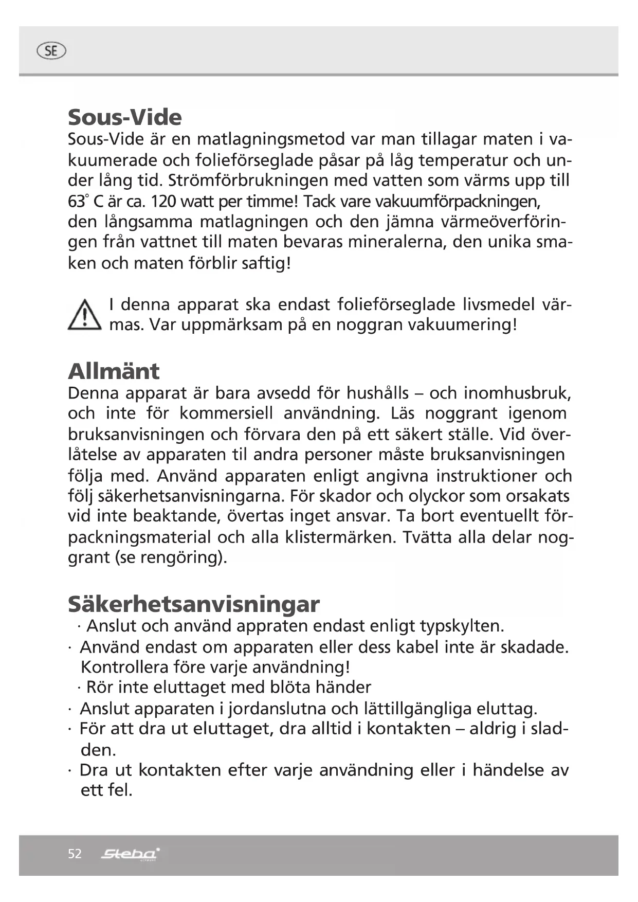 Denna apparat ar bara avsedd for hushåll - och inomhusbruk, och inte for kommersiell användning. Läs noggrant ingenbruksanvisningen och Förvara den på att sakerst stalle. Vid overlåtelse av apparaten til andra personer maste bruksanvisningen följa med. Använd apparaten enligt angivna instruktioner och följ sakerhetsanvisingarna. För skador och olyckor som orsakats vid inte beaktande, övertas inget ansvar. Ta bort eventuellt forpackningsmaterial och alla klistermärken. Tvätta alla delar noggrant (se rengöring).