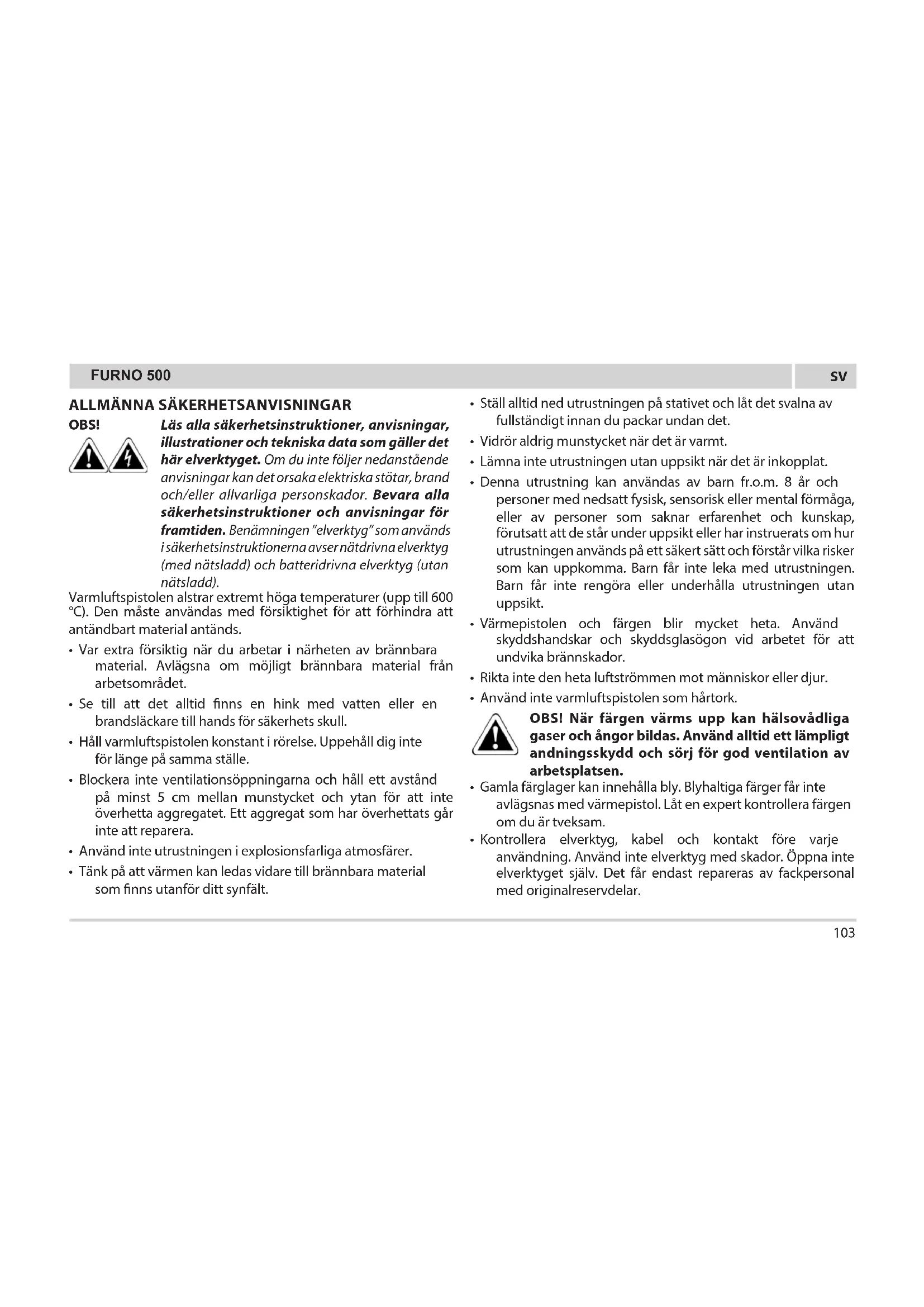 Ta bort färg Varmluftspistolen värmer upp ytan och gör att färgen blir mjuk så att den är lätt att skrapa av utan att skada ytan. En del färger blir mjuka även om det inte bildas bubblor, en del blir gummiaktiga och en del kräver högre värme. När man arbetar med era lager färg går det snabbare att skrapa av färgen om hela lagret av ytan värms upp, helt in till träet. därefter kan alla lager skrapas av på en gång. En mjuk borste kan vara det bästa verktyget att använda för mycket besvärliga ytor. Mineralfärger och ytbehandlingar, till exempel cementfärg och porslin, blir inte mjuka av värme så det fungerar inte att använda ett uppvärmningsverktyg för borttagning av sådan färg. Den bästa metoden för färgborttagning För varmluftspistolen sakta och stabilt framåt med en vinkel mot ytan. Peka munstycket i rörelseriktningen. Därmed kan du skrapa säkert utanför varmluftsströmmen och hålla skrapan och den skrapade ytan avsvalnad. A. Varm lyft förvärmer ytan. B. Färgen blir mjuk av varm luft. A + B. Djupgående penetrering av värme över hela ytan. C. Färgen kan enkelt skrapas av så snart den har blivit mjuk och varmluftspistolen rörs framåt. D. Låt den avskrapade ytan svalna. A B C D OBS: Använd inte varmluftspistolen på ytor som kan skadas av värme, till exempel vinylbelagda paneler, vinylbelagd fasadklädsel eller vinylbelagda fönsterkarmar. Vid borttagning av färg från fönsterkarmar blir kittet mjukt av värmen. Var försiktig så att inte kittet tas bort av skrapan. Kittet stelnar igen när det svalnar. Använd inte varmluftspistolen på isolerglasfönster som exempelvis Thermopane. Glaskantens expansion kan göra att kanttätningen brister. Vid avskrapning av fasader, överhetta inte kanterna på asfaltshingel som sticker ut över kanten. För hög temperatur smälter asfalten. VIKTIGT: Det är säkert att ta bort färgen med en varmluftspistol om ovanstående anvisningar följs, men håll alltid en behållare med vatten eller en ABC brandsläckare (lämplig mot bränder av klass A, B och C) inom räckhåll. Rengöring och underhåll Håll insugningsöppningarna på höljet rena och fria från hinder. Använd en mjuk, torr borste för att regelbundet rengöra öppningarna. Använd endast mild såplösning och en fuktig trasa för att rengöra varmluftspistolen. Många hushållsrengöringsmedel innehåller kemikalier som kan skada höljet allvarligt. Använd inte bensin, terpentin, lack- eller färgthinner, kemtvättmedel eller liknande produkter vid rengöring av varmluftspistolen. Låt ALDRIG någon vätska komma in i verktyget och sänk inte ner någon del av verktyget i vätska. Rengöring och underhåll ska inte utföras av barn. Förvaring Låt varmluftspistolens munstycke svalna till rumstemperatur innan den läggs på förvaringsplatsen. Munstycket blir mörkt med tiden på grund av den höga temperaturen. Detta är normalt och påverkar inte enhetens funktion eller livslängd.FURNO 500
