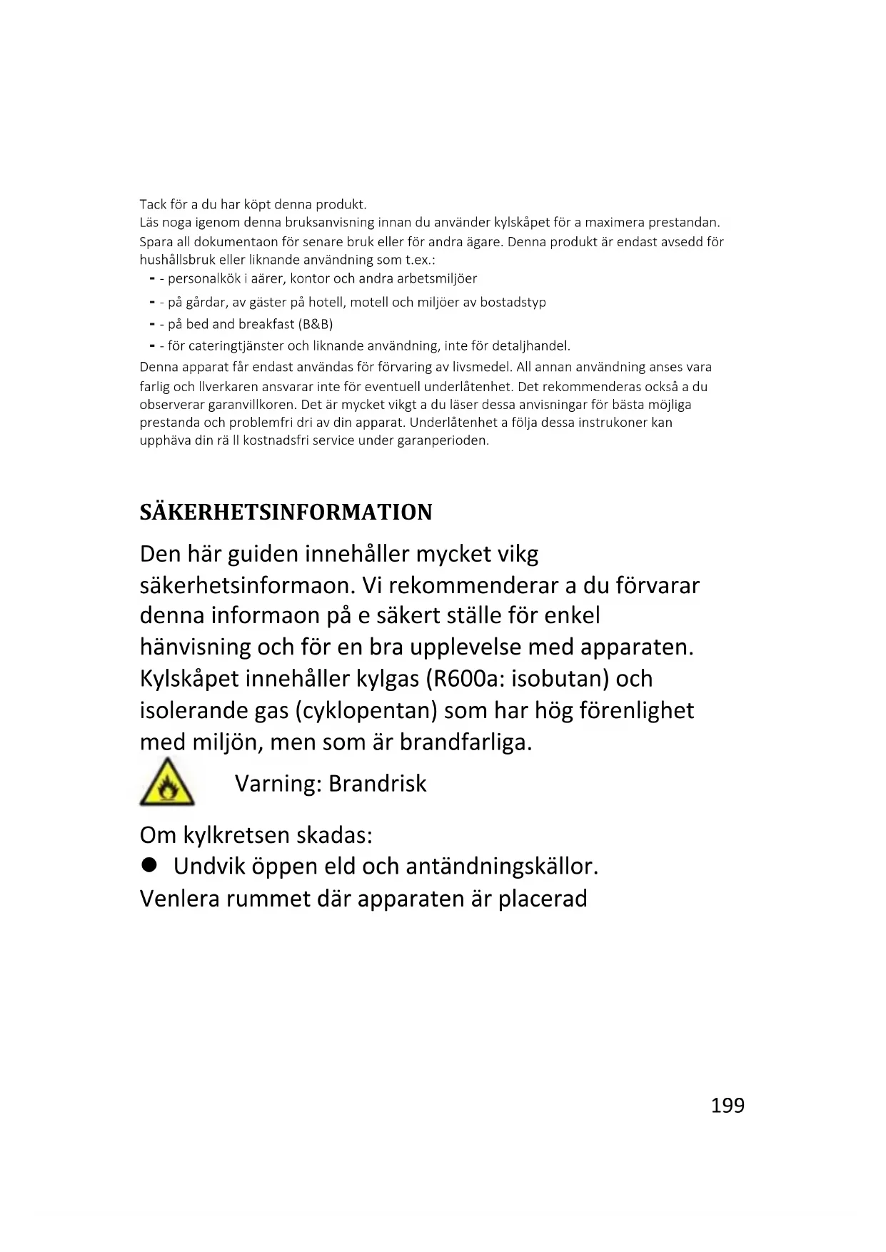 Den här guiden innehåller mycket vikg säkerhetsinformaon. Vi rekommenderar a du förvarar denna informaon på e säkert ställe för enkel hänvisning och för en bra upplevelse med apparaten. Kylskåpet innehåller kylgas (R600a: isobutan) och isolerande gas (cyklopentan) som har hög förenlighet med miljön, men som är brandfarliga.