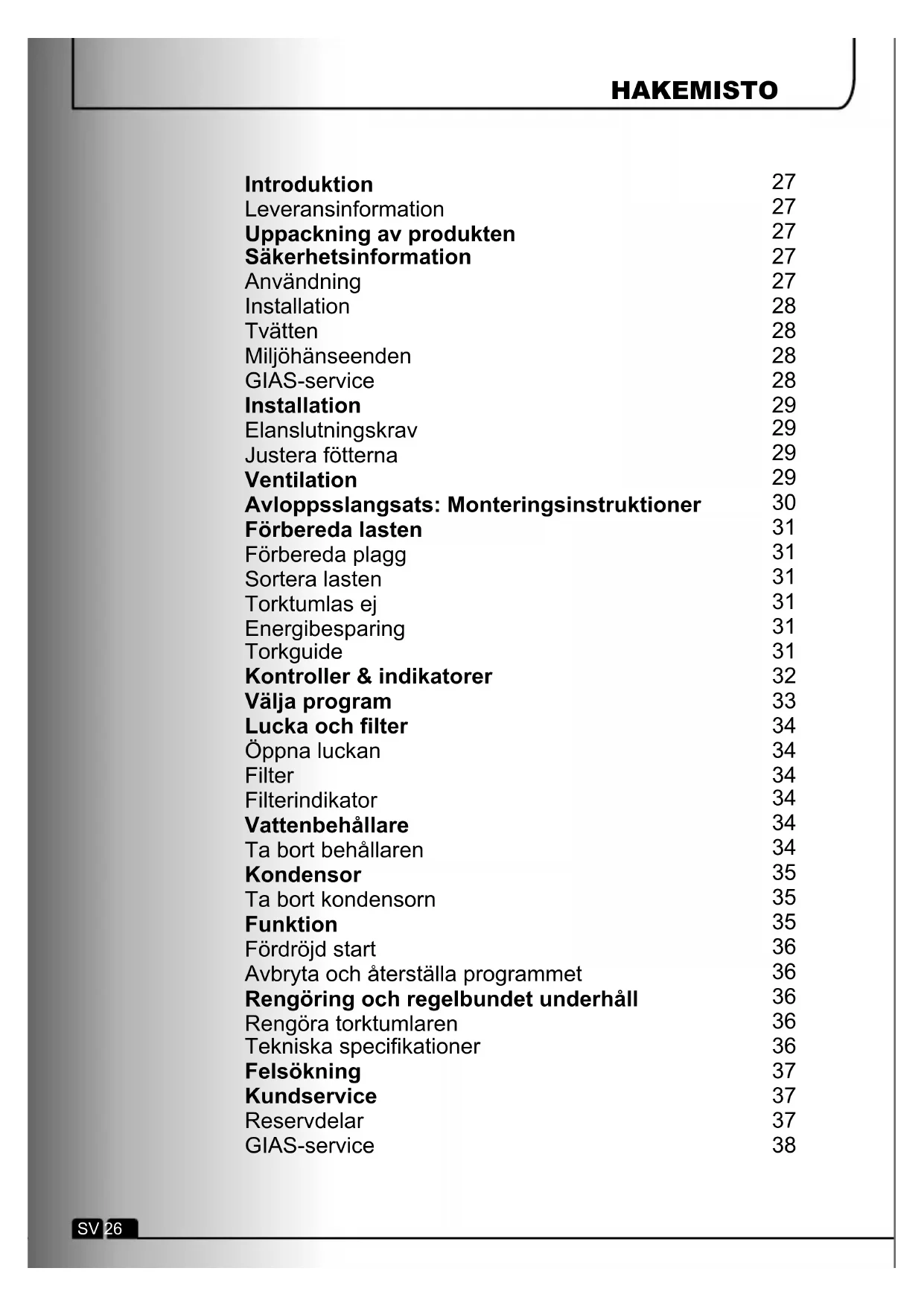 Introduktion Leveransinformation Uppackning av produkten Säkerhetsinformation Användning Installation Tvätten Miljöhänseenden GIAS-service Installation Elanslutningskrav Justera fötterna Ventilation Avloppsslangsats: Monteringsinstruktioner Förbereda lasten Förbereda plagg Sortera lasten Torktumlas ej Energibesparing Torkguide Kontroller & indikatorer Välja program Lucka och filter Öppna luckan Filter Filterindikator Vattenbehållare Ta bort behållaren Kondensor Ta bort kondensorn Funktion Fördröjd start Avbryta och återställa programmet Rengöring och regelbundet underhåll Rengöra torktumlaren Tekniska specifikationer Felsökning Kundservice Reservdelar GIAS-service HAKEMISTO SV 26INTRODUKTION Användning Kontrollera att följande föremål medföljde apparaten: ● Bruksanvisning ● Garantisedel ● Energietikett Ta u t m a s k i n e n u r förpackningen så nära dess slutliga installation- splats som möjligt.