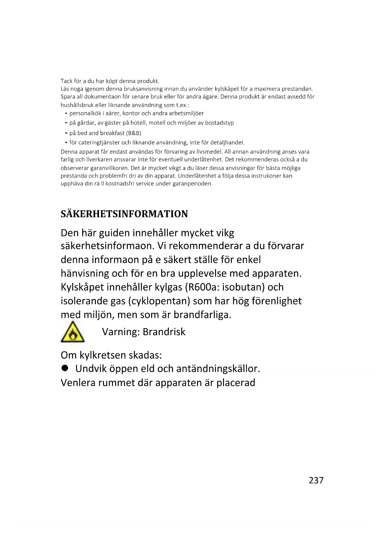 Varning: Brandrisk Om kylkretsen skadas: Undvik öppen eld och antändningskällor. Ventilera rummet där apparaten är placerad Procentandel körs238 VARNING! Försiktighet måste vidtas när apparaten rengörs eller bärs för att undvika att röra kondensatorns metalltråd på baksidan av apparaten eftersom du kan skada dina fingrar och händer eller skada din produkt. Denna apparat är inte utformad för att staplas på någon annan apparat. Försök inte att sitta eller stå längst upp på apparaten eftersom den inte är avsedd för sådan användning. Du kan skada dig själv eller apparaten. Se till att nätsladden inte ligger under apparaten medan och efter att du flyttar den för att undvika att nätsladden skärs av eller skadas. När du placerar apparaten ska du vara försiktig så att du inte skadar golv, rör, väggbeklädnad etc. Flytta inte apparaten genom att dra i locket eller handtaget. Låt inte barn leka med apparaten eller manipulera kontrollerna. Vårt företag accepterar inte något ansvar om anvisningarna inte följs. Installera inte apparaten på fuktiga, oljiga eller dammiga ställen och utsätt den inte för direkt solljus och vatten. Installera inte apparaten i närheten av värmeelement eller lättantändliga material. Öppna inte locket vid strömavbrott. Frysta livsmedel bör inte påverkas om felet varar i mindre än 20 timmar. Om felet varar längre ska livsmedlen239 kontrolleras och ätas omedelbart eller kokas och därefter frysas om. Om du upptäcker att locket på frysboxen är svårt att öppna efter att du har stängt det ska du inte oroa dig. Detta beror på tryckskillnaden som kommer att jämnas ut och öppna locket normalt efter några minuter. Anslut inte apparaten till elnätet förrän du har tagit bort alla förpacknings- och transportskydd. Låt stå i minst 4 timmar innan du slår på den för att kompressoroljan ska kunna lösas om den transporteras horisontellt. Denna frys får endast användas för avsedd användning (dvs förvaring och frysning av ätbara livsmedel). Förvara inte medicin eller forskningsmaterial i vinkylare. När material som kräver en strikt kontroll av förvaringstemperaturer ska förvaras kan det försämras eller det kan uppstå en okontrollerad reaktion som kan orsaka risker. Dra ut nätsladden ur eluttaget innan du utför några åtgärder. Kontrollera vid leveransen att produkten inte är skadad och att alla delar och tillbehör är i perfekt skick. Om en läcka upptäcks i kylsystemet ska du inte vidröra vägguttaget och inte använda öppen eld. Öppna fönstret och släpp in luft i rummet.240 Kontakta sedan servicecenter och be om reparation. Använd inte förlängningssladdar eller adaptrar. Dra inte ut nätsladden kraftigt eller vik den inte, och vidrör inte kontakten med våta händer. Skada inte kontakten och/eller nätsladden. Detta kan orsaka elstötar eller bränder. Om nätkabeln är skadad måste den bytas ut av tillverkaren, dess servicetekniker eller liknande kvalificerad person för att undvika fara. Placera eller förvara inte brandfarliga och mycket flyktiga material som t.ex. eter, bensin, gasol, propangas, aerosolsprayburkar, lim, ren alkohol etc. Dessa material kan orsaka explosion. Använd inte och förvara inte brandfarliga sprayer, som till exempel sprayfärg, nära vinkylaren. Det kan orsaka explosion eller brand. Placera inte föremål och/eller behållare fyllda med vatten ovanpå apparaten. Vi rekommenderar att inte använda förlängningssladdar och grenuttag. Kassera inte apparaten vid brand. Var försiktig så att du inte skadar kylkretsen/rören vid transport och användning. Vid eventuell skada ska du inte utsätta apparaten för brand, potentiella antändningskällor och rummet där apparaten är placerad ska ventileras omedelbart. Kylsystemet som finns bakom och inne i vinkylaren241 innehåller kylmedel. Undvik därför att skada rören. Använd inte elektriska apparater inne i apparatens matförvaringsfack, om de inte är av en typ som rekommenderas av tillverkaren. Skada inte kylkretsen. Använd inte andra mekaniska enheter eller andra medel för att påskynda avfrostningen än de som rekommenderas av tillverkaren. Använd inte elektriska apparater inne i matförvaringsfacken, om de inte är av en typ som rekommenderas av tillverkaren. Vidrör inte de inre kylelementen, särskilt inte med våta händer, för att undvika sprickor eller skador. Håll ventilationsöppningarna i apparatens hölje eller i den inbyggda strukturen fria från hinder. Använd inte spetsiga eller skarpa objekt som t.ex. knivar eller gafflar för att ta bort frosten. Använd aldrig hårtorkar, elvärmare eller andra liknande elektriska apparater för avfrostning. Skrapa inte med en kniv eller ett med skarpt föremål för att ta bort frost eller is. Det kan orsaka skada på kylkretsen och spillet kan orsaka brand eller skada ögonen. Använd inte mekaniska apparater eller någon annan utrustning för att påskynda avfrostningen. Använd absolut inte öppen eld eller elektrisk utrustning som till exempel värmare, ångrenare, ljus, oljelampor, etc för att påskynda242 avfrostningsfasen. Använd aldrig vatten för att rengöra kompressorn, torka den noggrant med en torr trasa efter rengöring för att förhindra rost. Vi rekommenderar att du håller stickkontakten ren eftersom för mycket dammrester på kontakten kan orsaka brand. Produkten är endast avsedd och tillverkad för hemmabruk. Garantin gäller inte om produkten installeras eller används i kommersiella fastigheter eller fastigheter som inte är privata hushåll. Produkten måste installeras korrekt, placeras och användas i enlighet med anvisningarna i den medföljande bruksanvisningen. Garantin gäller endast nya produkter och kan inte överlåtas om produkten säljs vidare. Vårt företag avstår från allt ansvar för tillfälliga skador eller följdskador. Garantin minskar inte på något sätt dina lagstadgade eller lagliga rättighete