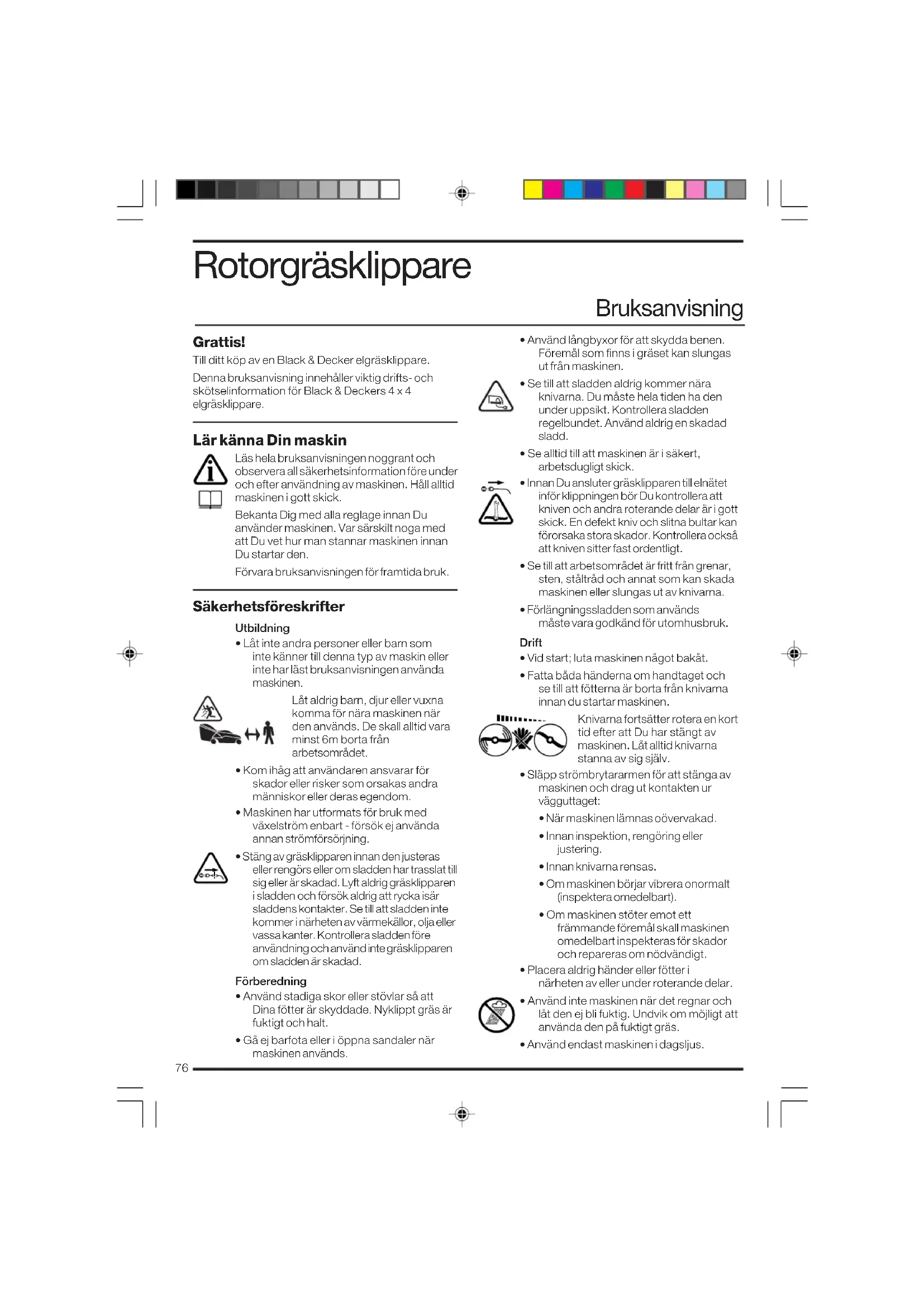 Denna bruksanvisning innehåller viktig drifts- och skötselinformation för Black & Deckers 4 x 4 elgräsklippare.