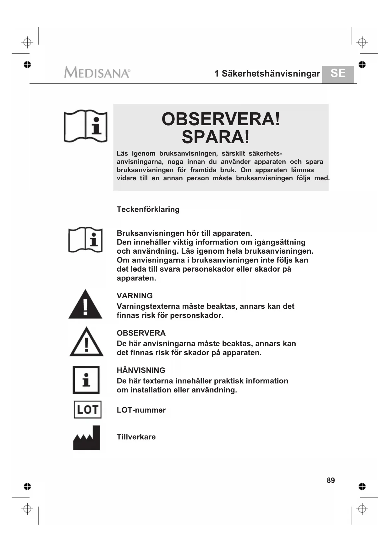 1 Säkerhetshänvisningar OBSERVERA! SPARA! Bruksanvisningen hör till apparaten. Den innehåller viktig information om igångsättning och användning. Läs igenom hela bruksanvisningen. Om anvisningarna i bruksanvisningen inte följs kan det leda till svåra personskador eller skador på apparaten. VARNING Varningstexterna måste beaktas, annars kan det finnas risk för personskador. OBSERVERA De här anvisningarna måste beaktas, annars kan det finnas risk för skador på apparaten. HÄNVISNING De här texterna innehåller praktisk information om installation eller användning. Tillverkare Läs igenom bruksanvisningen, särskilt säkerhets- anvisningarna, noga innan du använder apparaten och spara bruksanvisningen för framtida bruk. Om apparaten lämnas Teckenförklaring vidare till en annan person måste bruksanvisningen följa med. LOT-nummerSE 1 Säkerhetshänvisningar